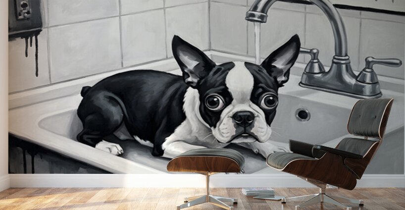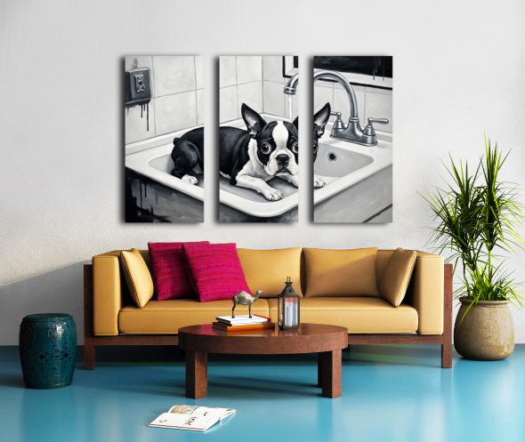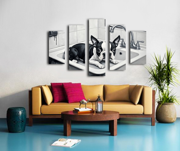 ABOUT THIS ARTWORK: BOSTON TERRIER PUPPY WAITS NERVOUSLY IN BATHROOM SINK