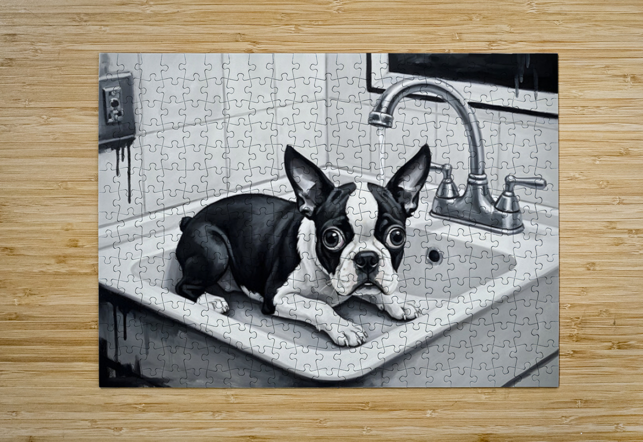 Boston Terrier Puppy Waits Nervously In Bathroom Sink Puppy Prints Puzzle printing