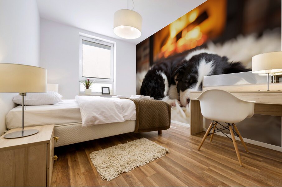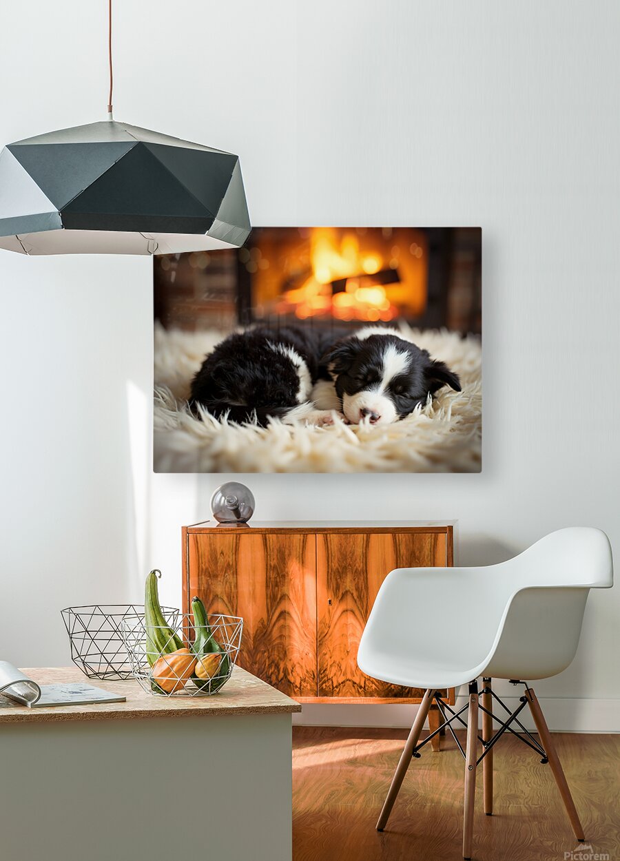 ABOUT THIS ARTWORK: HAPPY BORDER COLLIE PUPPY ENJOYS PERFECT EVENING BY THE FIRE
