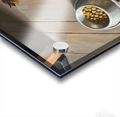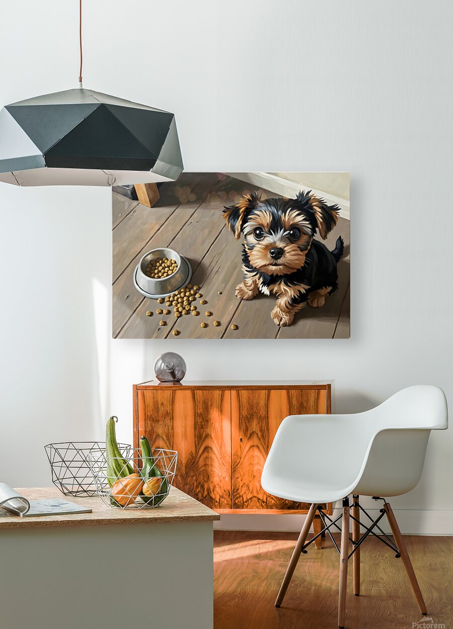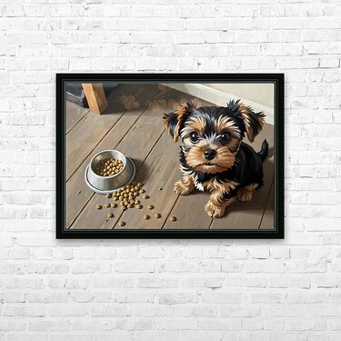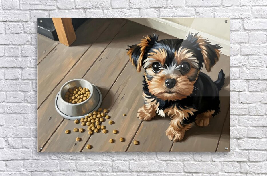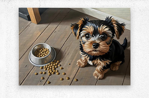 A brown and black Yorkshire Terrier puppy gazes upward with remarkably wide apologetic dark eyes. The small puppy sits on wooden flooring beside an overturned metal food bowl with scattered kibble pieces surrounding the area. Digital Artwork.