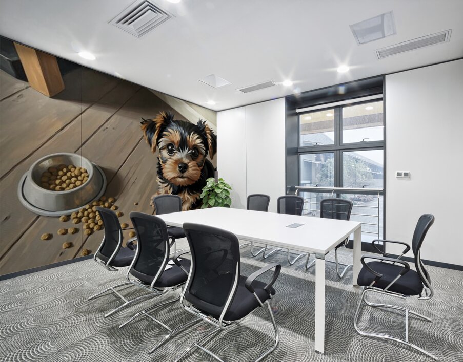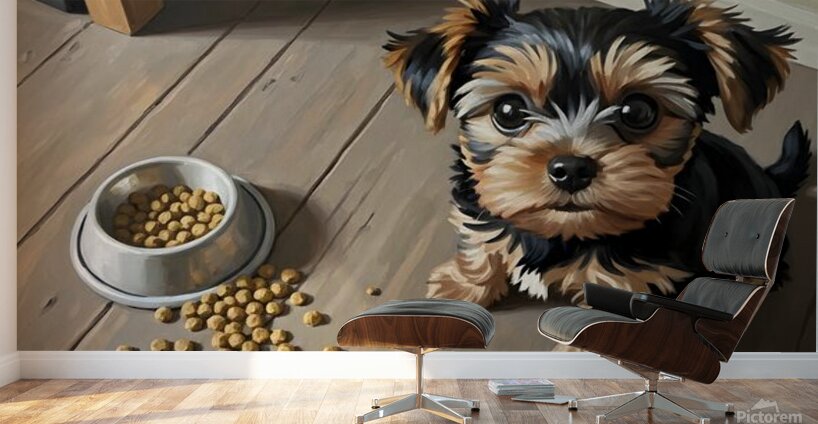 SUR CETTE OEUVRE: BROWN YORKSHIRE TERRIER PUPPY WITH OVERTURNED FOOD BOWL