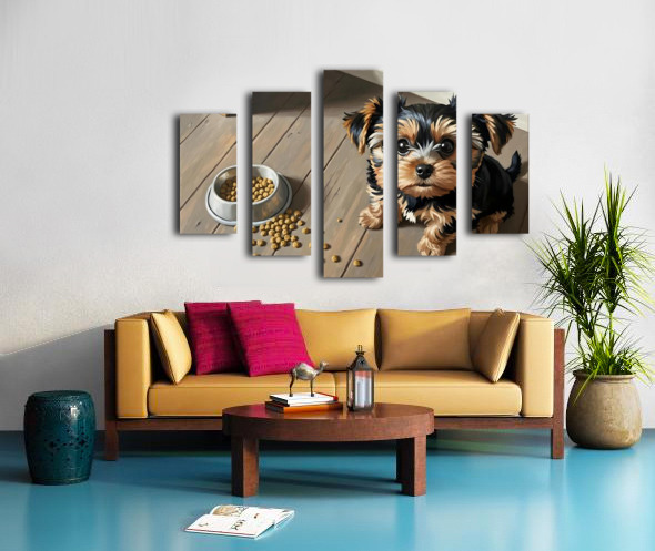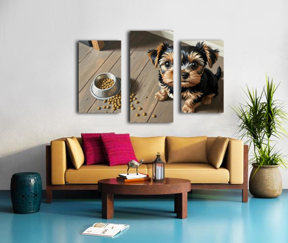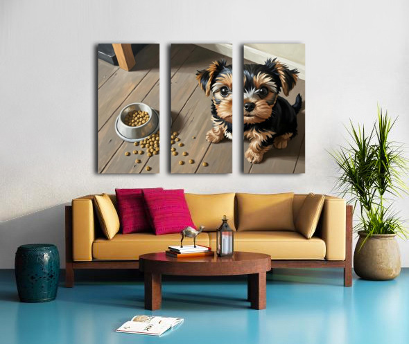 Brown Yorkshire Terrier Puppy With Overturned Food Bowl Impression sur toile
