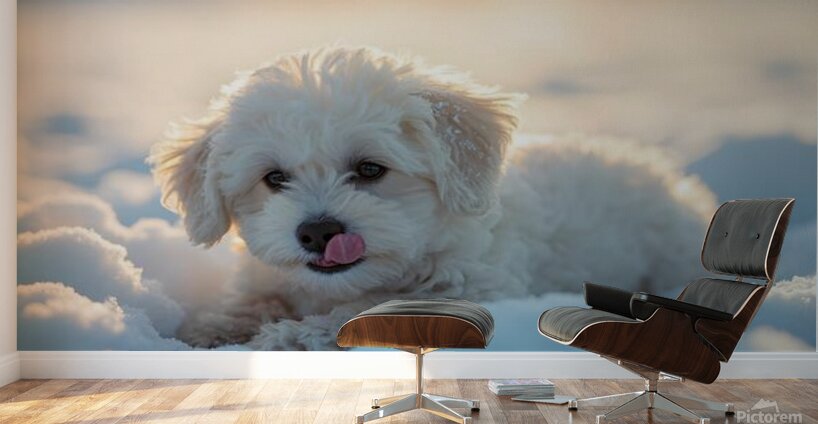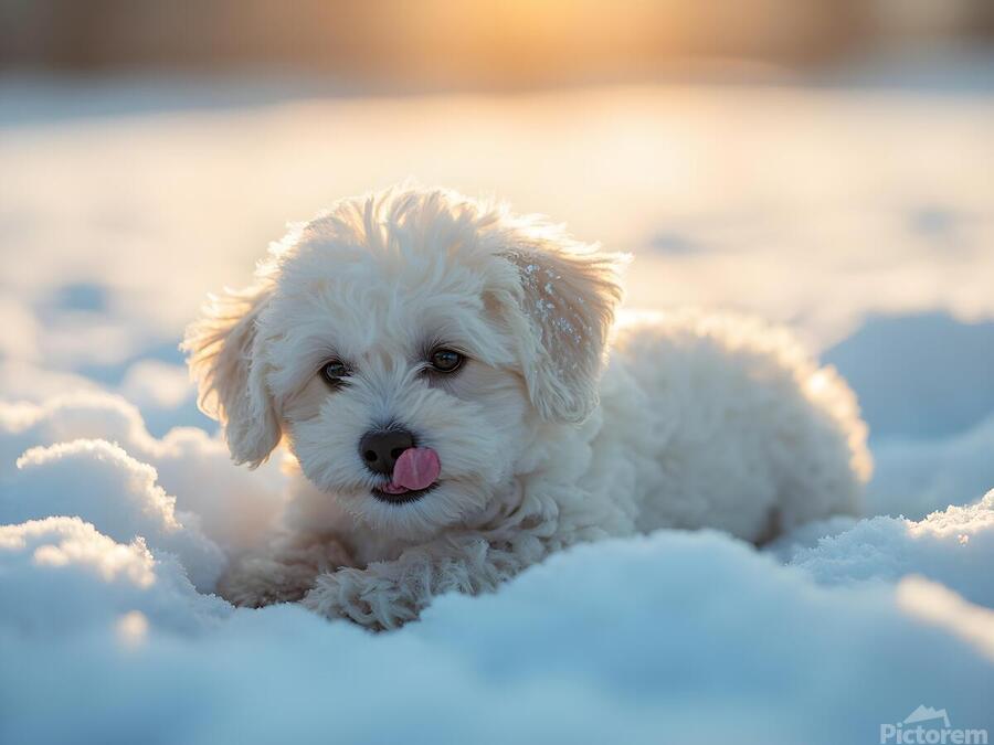 SUR CETTE OEUVRE: CONTENT WHITE BICHON FRISE PUPPY RESTING AFTER SNOW PLAY SESSION