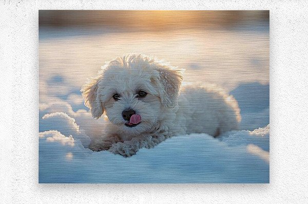 The white Bichon Frise puppy sits peacefully in the snow tiny snowflakes decorating its fluffy coat. After an energetic play session the happy puppy pants contentedly in the gentle winter sunlight. Digital Artwork.