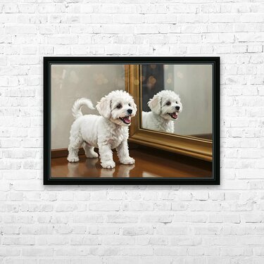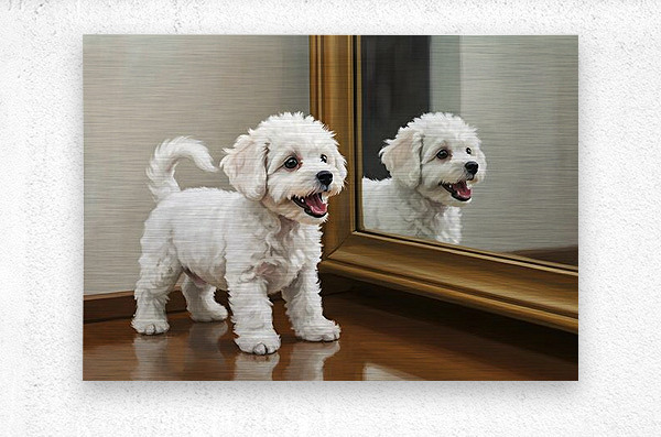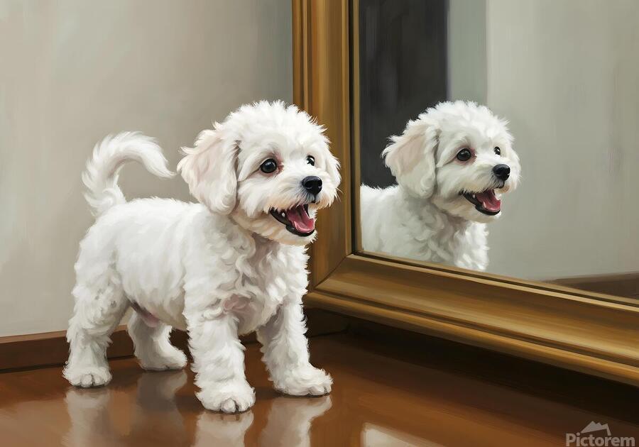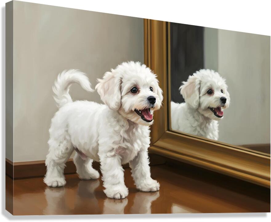 The energetic white Bichon Frise puppy assumes a play bow position before the mirror tail high and wagging. Its fluffy white curls bounce with excitement as it tries to engage with its reflection. Digital Artwork.