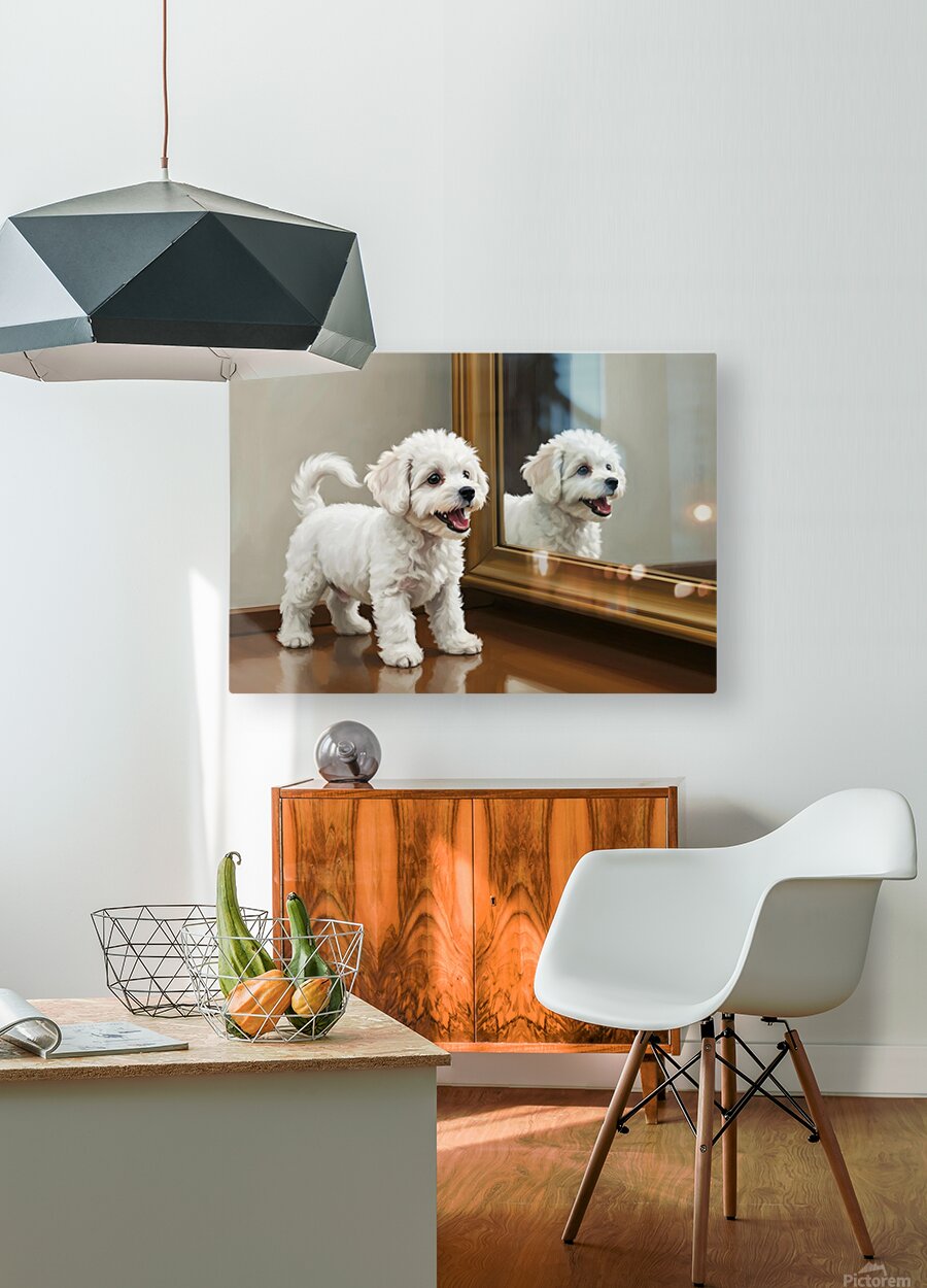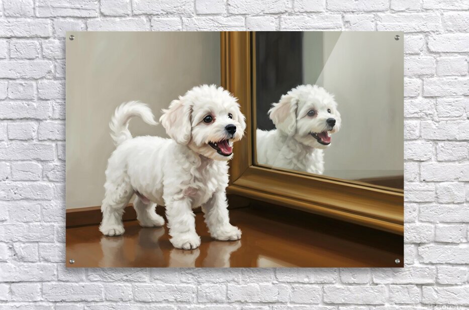 SUR CETTE OEUVRE: PLAYFUL WHITE BICHON FRISE PUPPY INVITES MIRROR REFLECTION TO PLAY