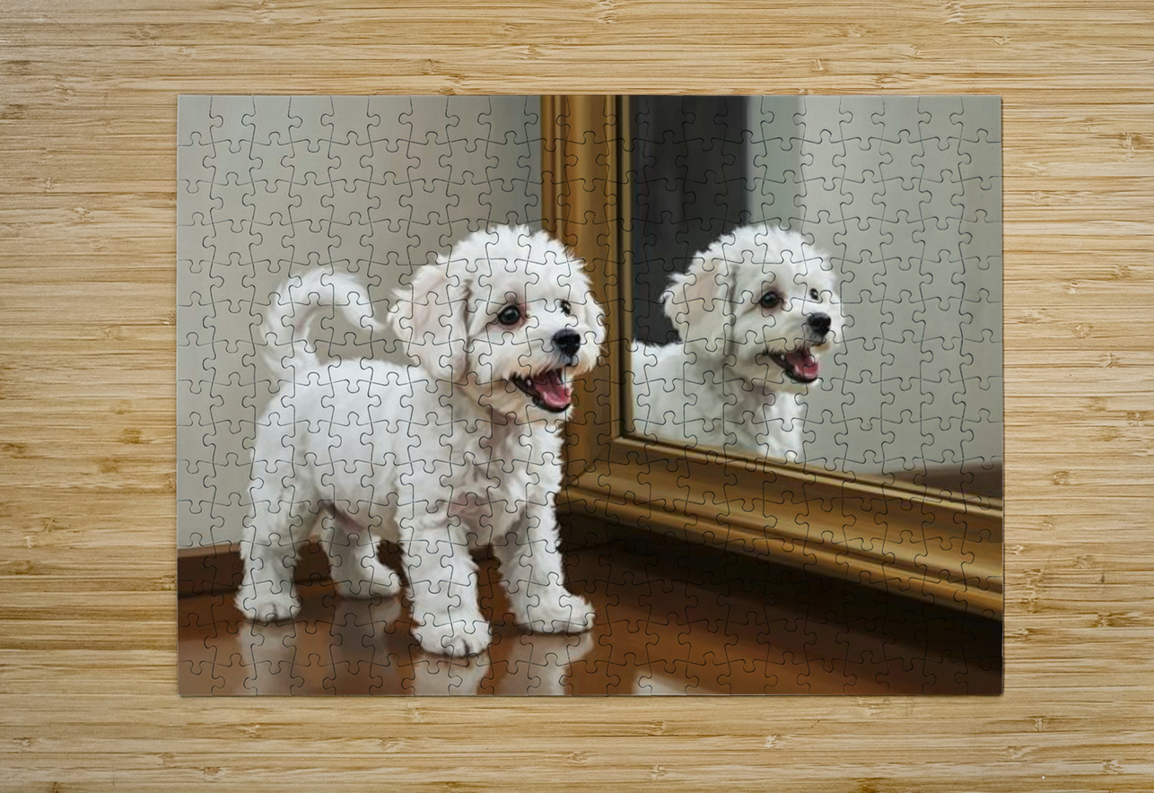 Playful White Bichon Frise Puppy Invites Mirror Reflection To Play Puppy Prints Impression de puzzle