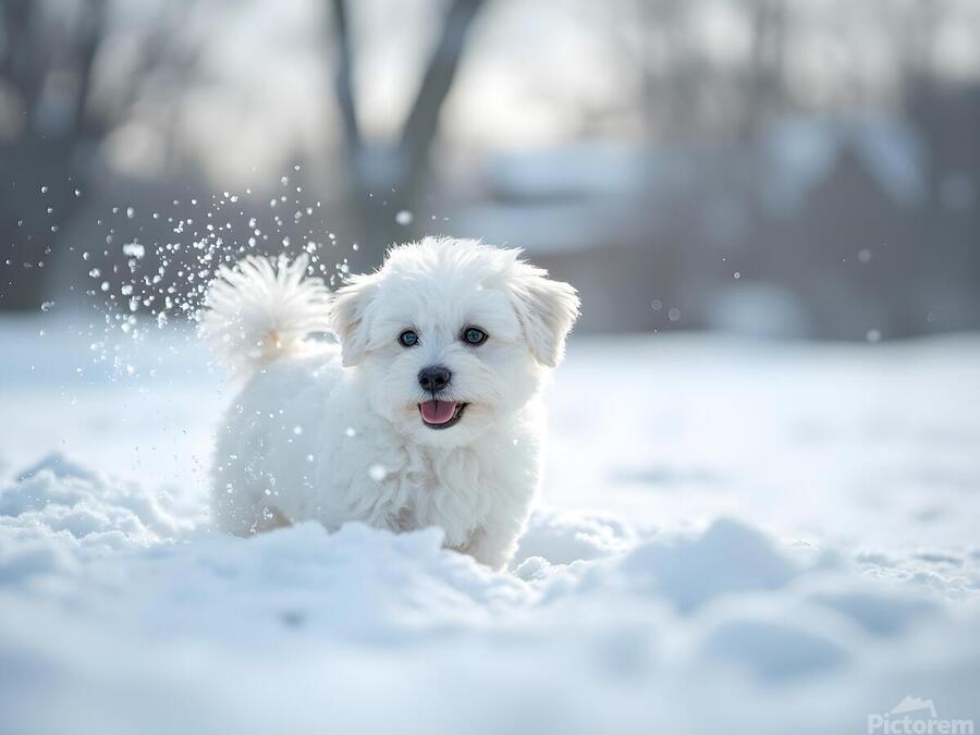 A fluffy white Bichon Frise puppy stands at the edge of a snow-covered yard eyes bright with curiosity and tail wagging enthusiastically. The pristine...[+]
