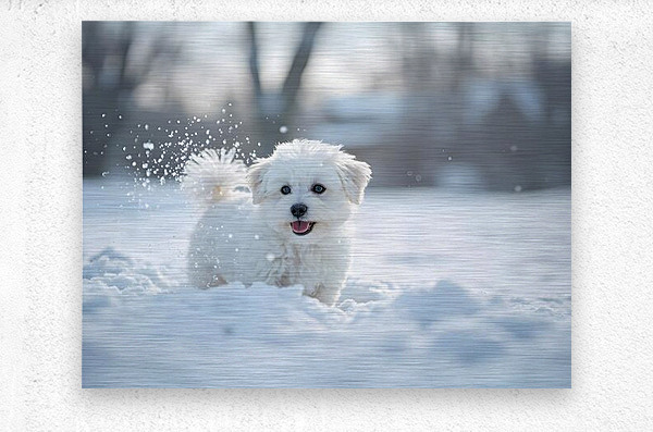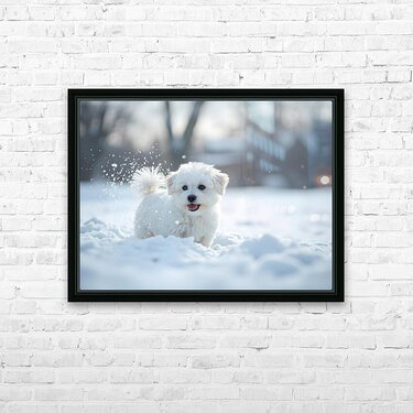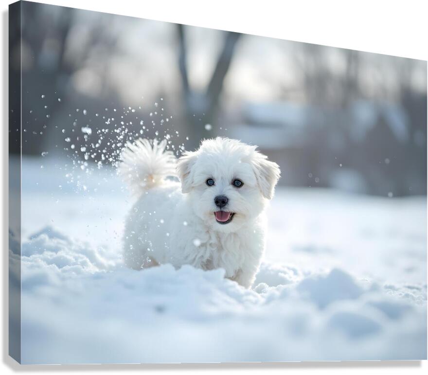 A fluffy white Bichon Frise puppy stands at the edge of a snow-covered yard eyes bright with curiosity and tail wagging enthusiastically. The pristine white snow creates a winter wonderland around the excited little dog. Digital Artwork.