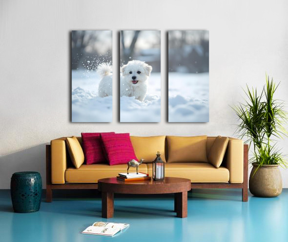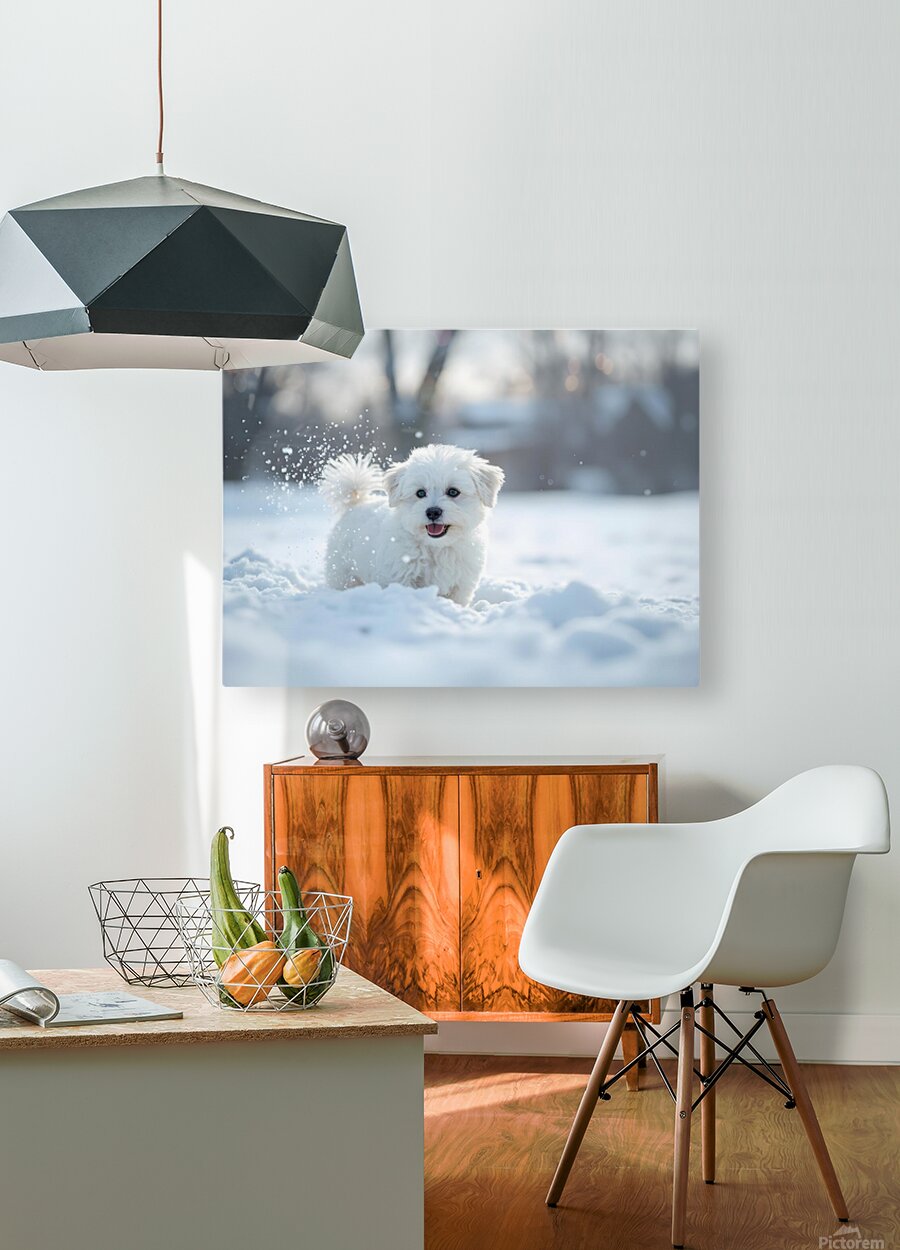 SUR CETTE OEUVRE: WHITE BICHON FRISE PUPPY DISCOVERS FRESH SNOW IN WINTER YARD