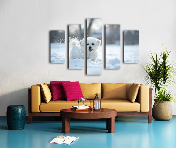 White Bichon Frise Puppy Discovers Fresh Snow In Winter Yard Impression sur toile