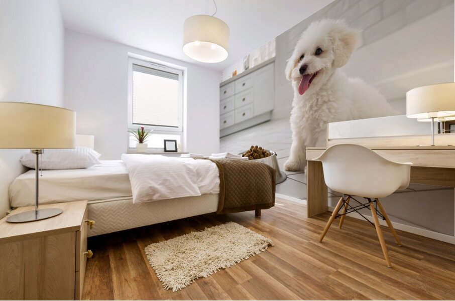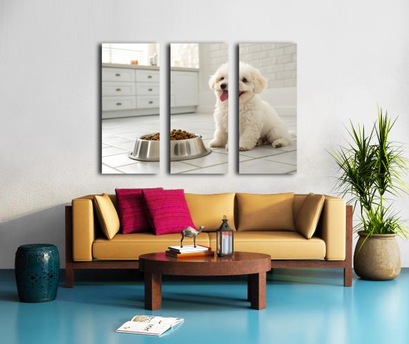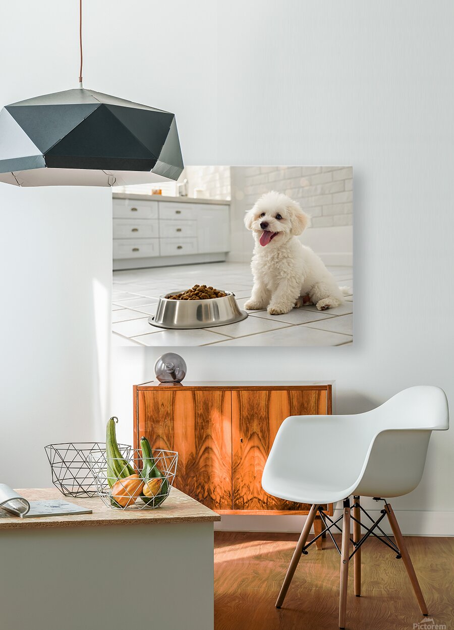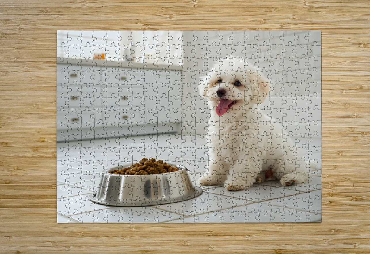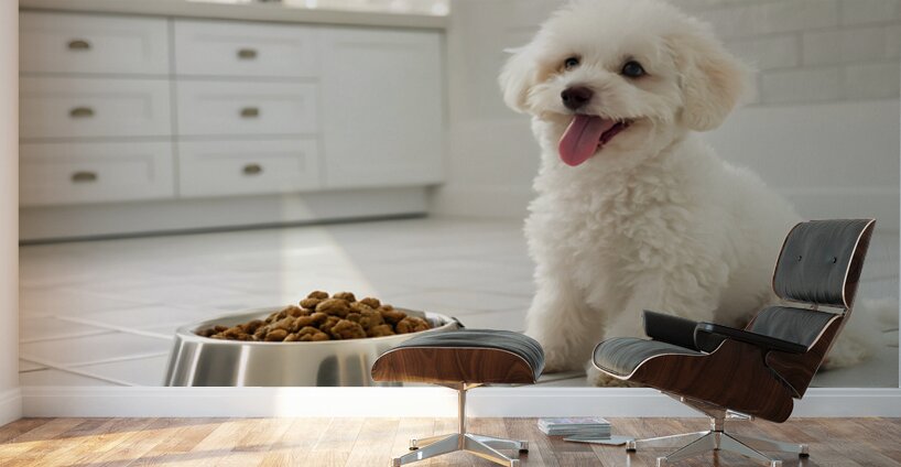 A fluffy white poodle puppy sits eagerly beside a metal food bowl filled with brown kibble in a clean, bright kitchen setting with white tiled floors Digital Artwork.