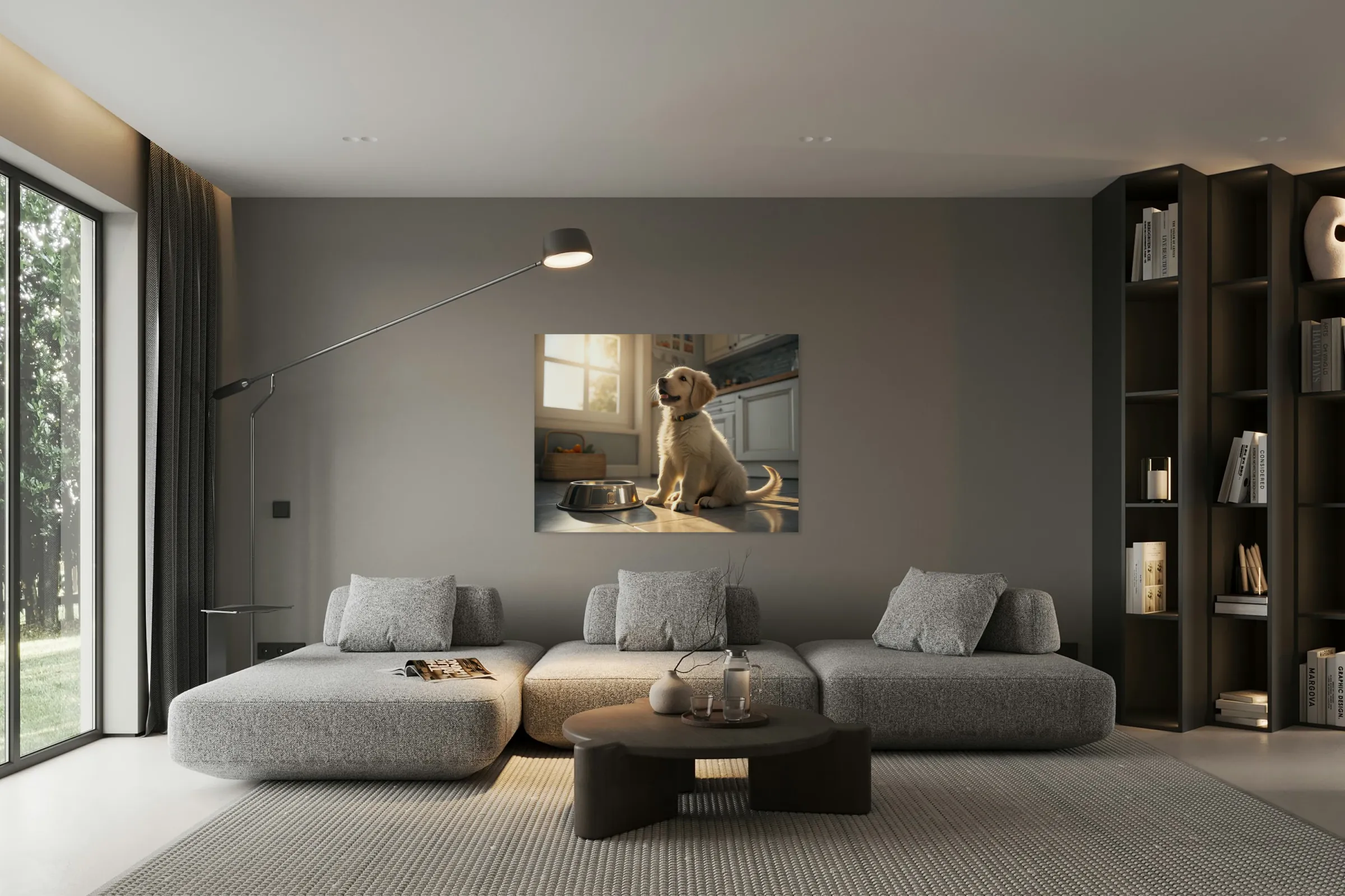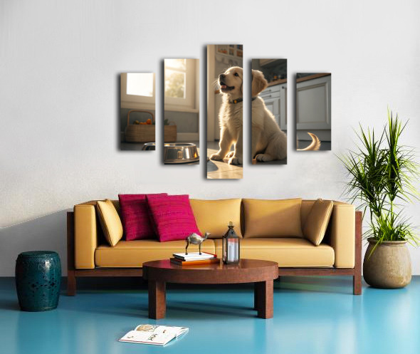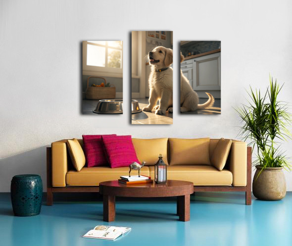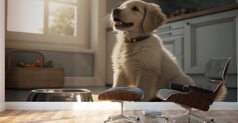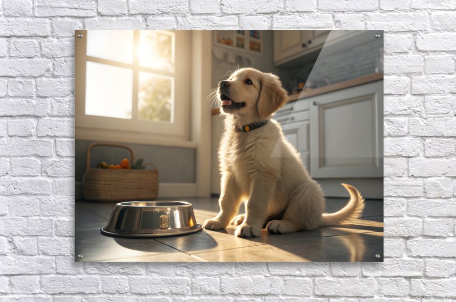 A young golden retriever puppy sits beside an empty silver food bowl on a clean kitchen floor. The puppy's fluffy golden coat gleams in the morning light as it stares hopefully at the empty bowl with bright, expectant eyes. Digital Artwork.