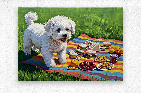 A small white fluffy Bichon Frise puppy with curly fur walks toward a red and white checkered picnic blanket laid out on bright green grass with an assortment of delicious foods displayed on ceramic plates. Digital Artwork.