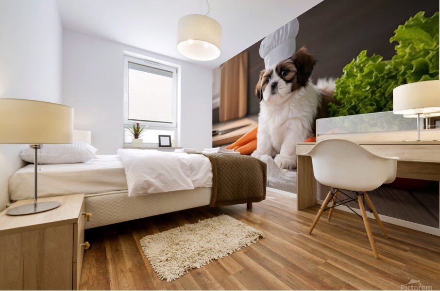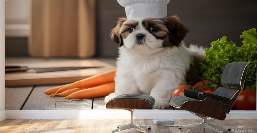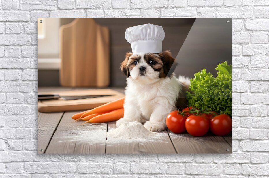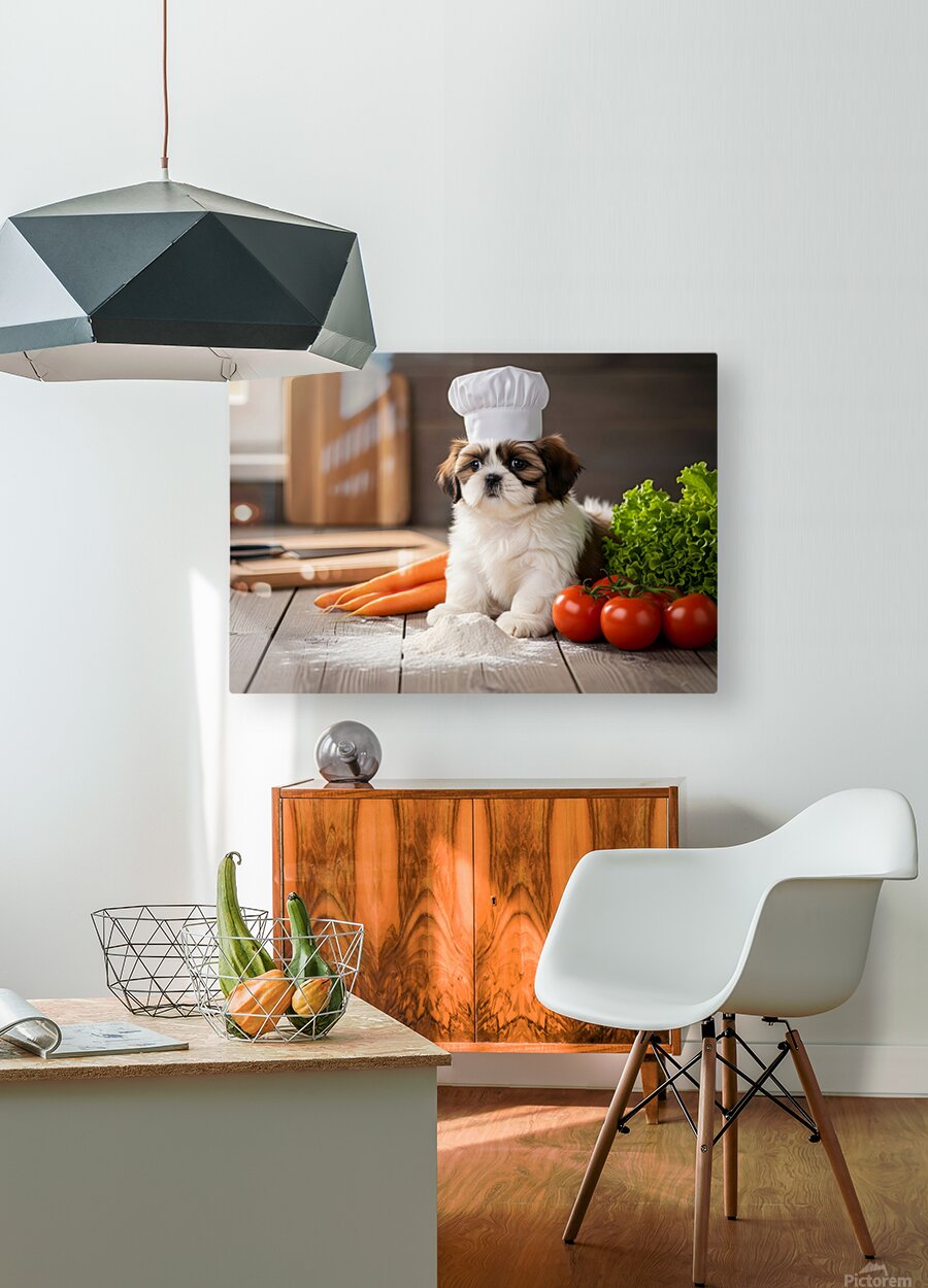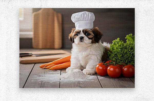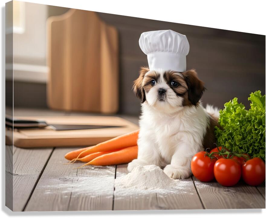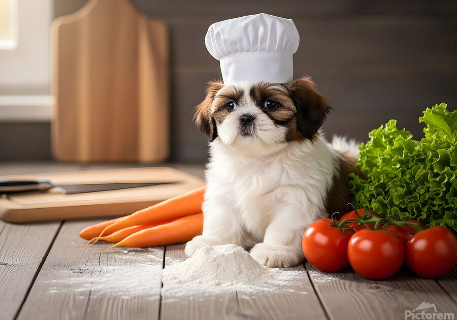 An adorable white and brown Shih Tzu puppy sits proudly wearing a tiny white chefs hat. Fresh colorful vegetables surround the eager pup on a rustic wooden kitchen counter with flour dusting the surface. Digital Artwork.