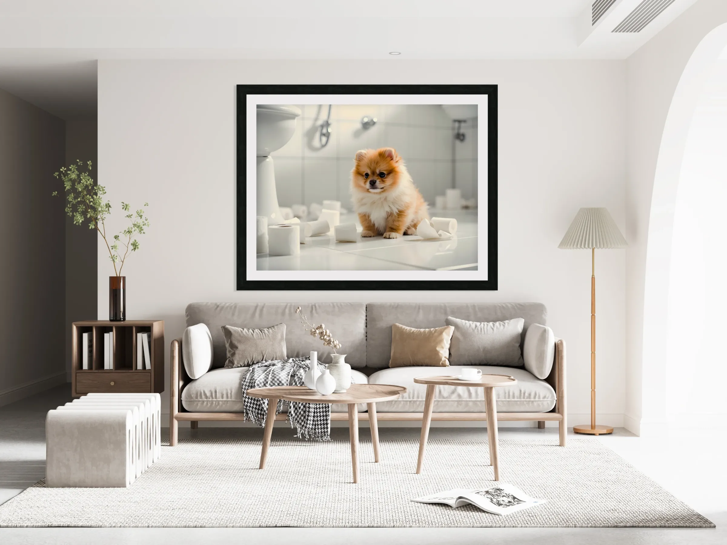 Pomeranian Puppy Discovers Toilet Paper Roll Impression du cadre