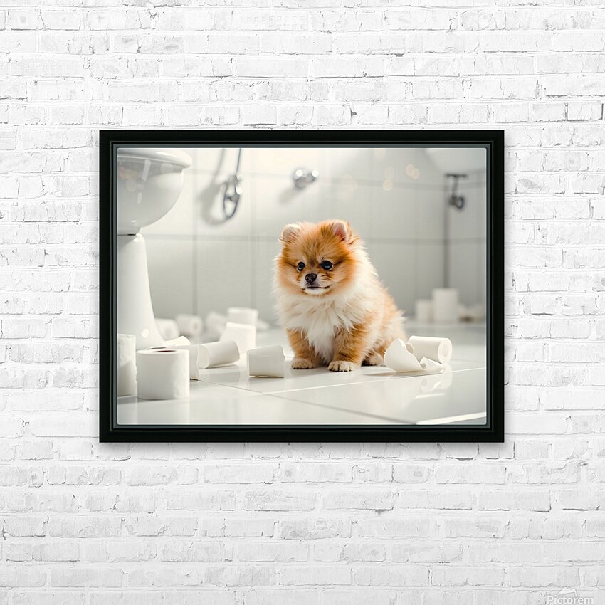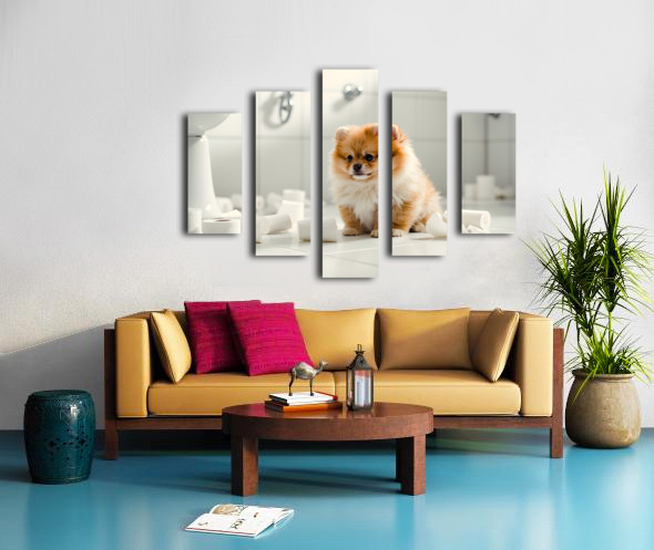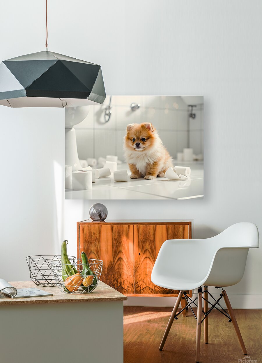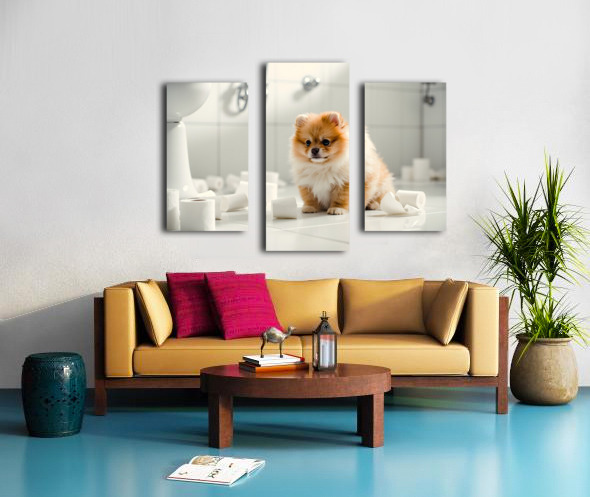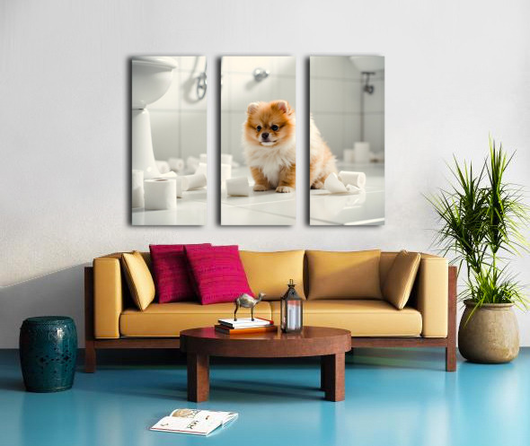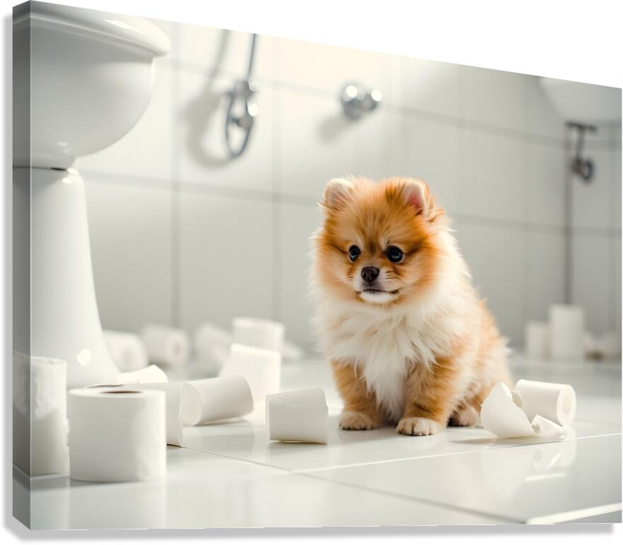 Pomeranian Puppy Discovers Toilet Paper Roll Impression sur toile