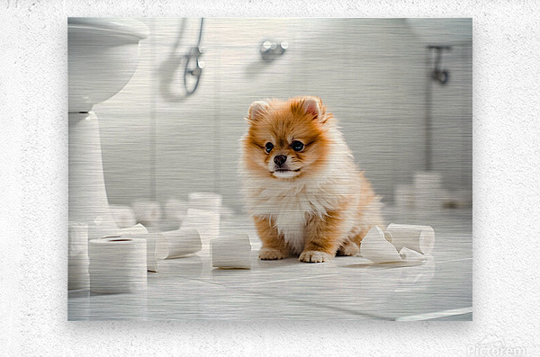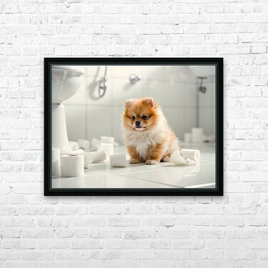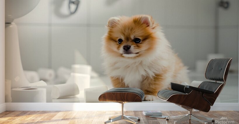 SUR CETTE OEUVRE: POMERANIAN PUPPY DISCOVERS TOILET PAPER ROLL