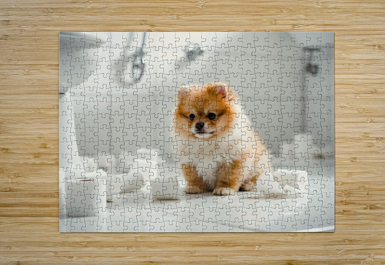 Pomeranian Puppy Discovers Toilet Paper Roll Puppy Prints Impression de puzzle