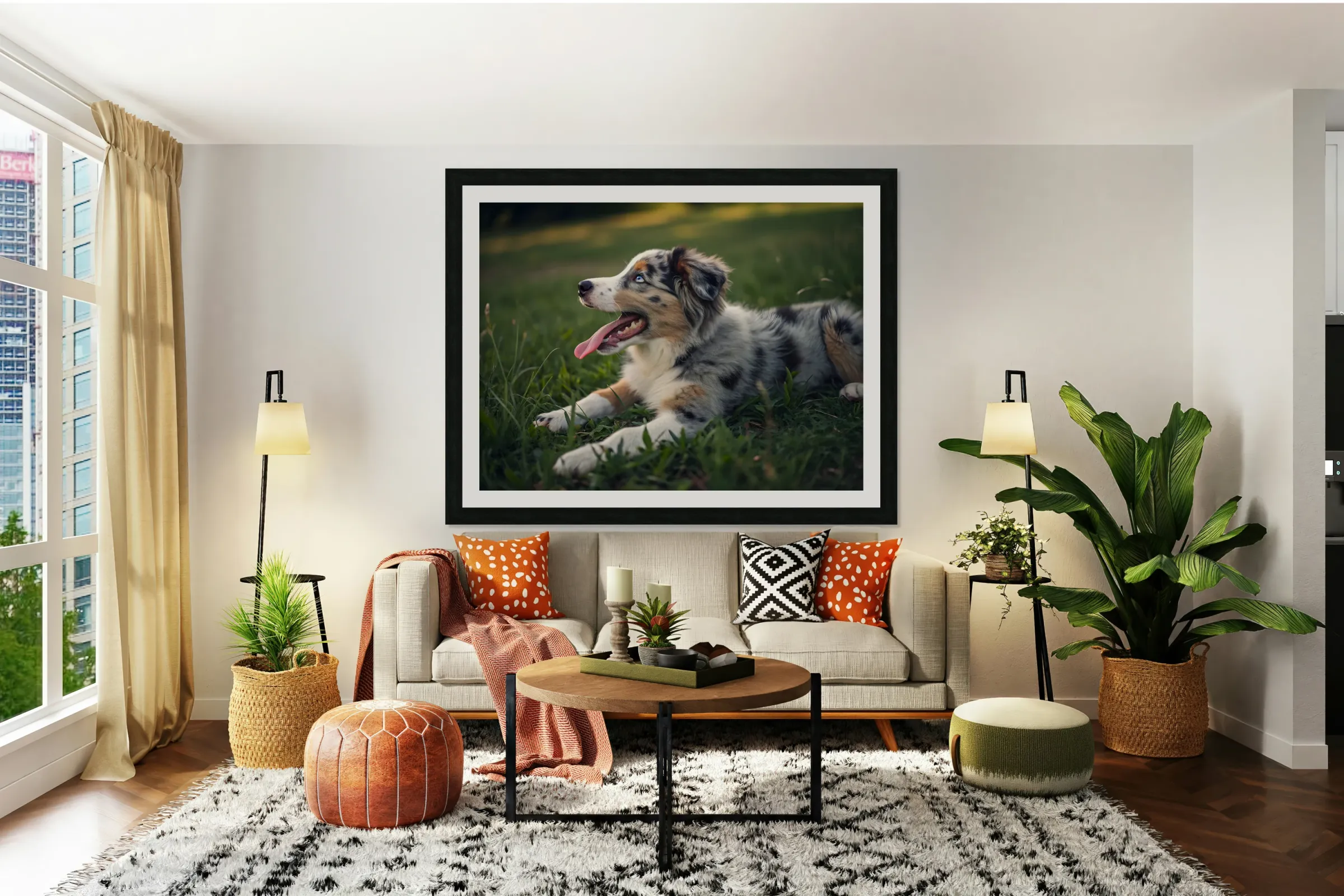 SUR CETTE OEUVRE: TIRED AUSTRALIAN SHEPHERD PUPPY RESTS AFTER ZOOMIES