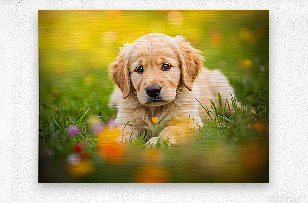 A fluffy golden retriever puppy lies flat on green grass with legs spread wide in a sploot position. The young dog has a curious expression with bright eyes and golden fur catching sunlight. Blurred flowers create a soft foreground. Digital Artwork.