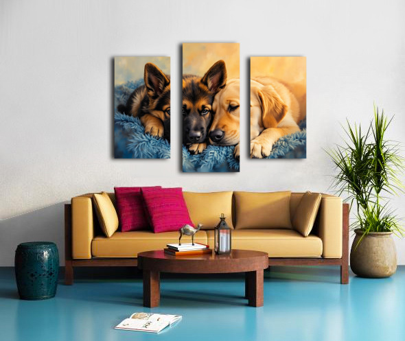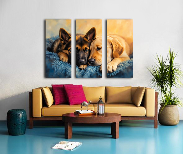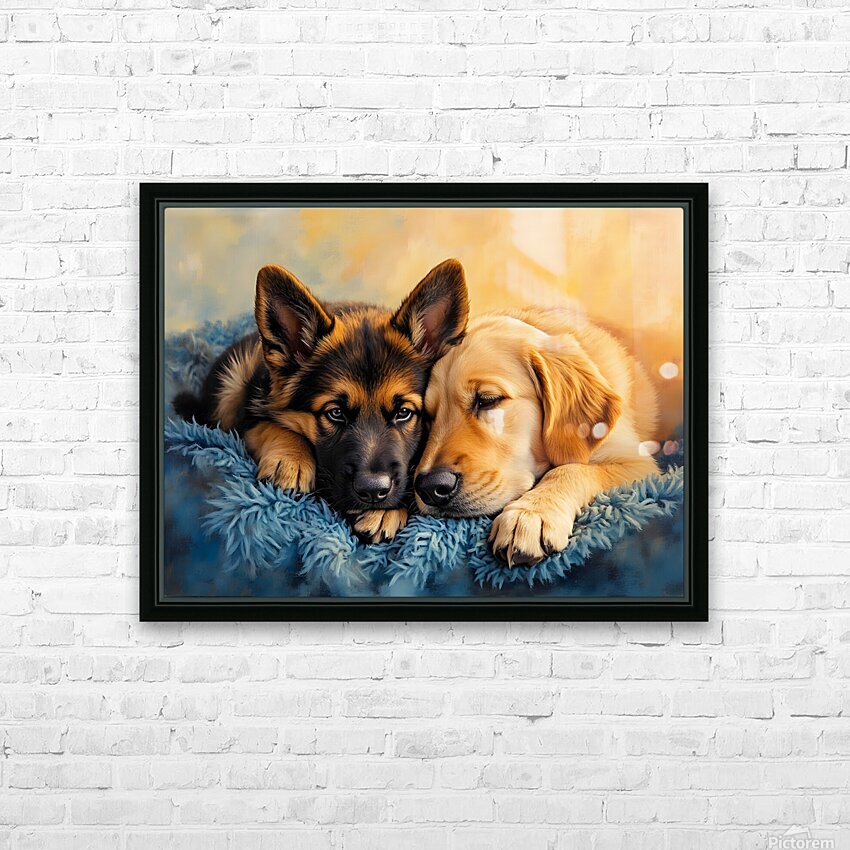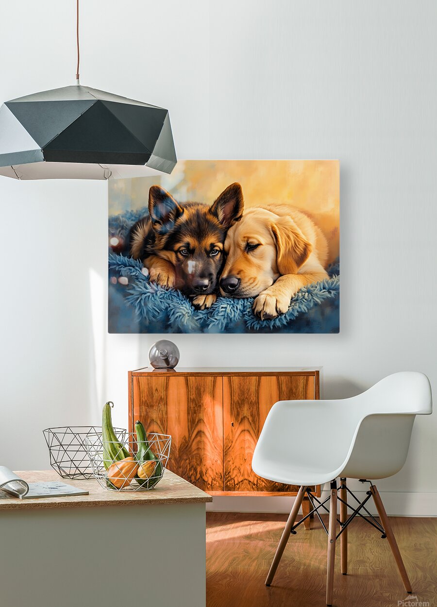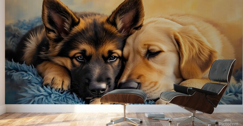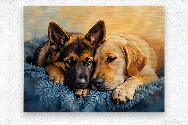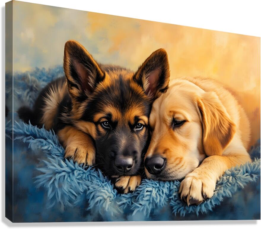 SUR CETTE OEUVRE: GERMAN SHEPHERD PUPPY SNUGGLES WITH GOLDEN FRIEND