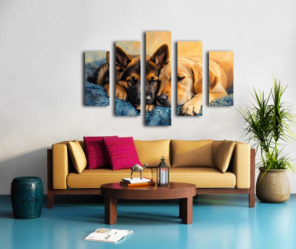 A content German Shepherd puppy with brown and black markings rests peacefully snuggled against a large golden retriever on a blue blanket in warm light Digital Artwork.