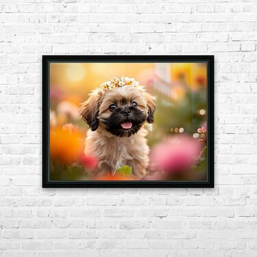 Shih Tzu Puppy Discovers Beautiful Flower Crown Impression du cadre