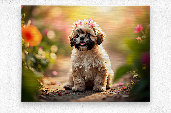 An alert cream and brown Shih Tzu puppy sits proudly on a garden path wearing its beautiful flower crown. The little dog gazes confidently ahead while surrounded by the soft colors of a blooming garden. Digital Artwork.