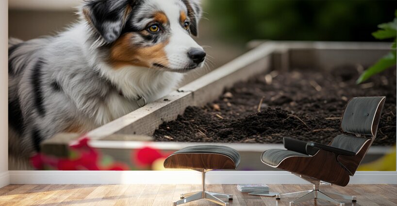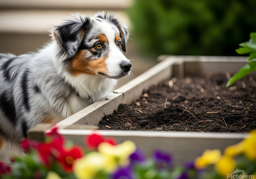 A young Australian Shepherd puppy with distinctive blue merle markings and amber eyes stands beside a raised wooden garden bed filled with rich dark soil. The puppy appears curious and alert ready to explore this new outdoor space. Digital Artwork.