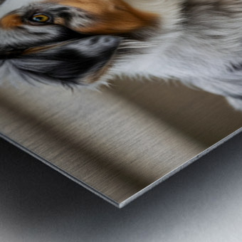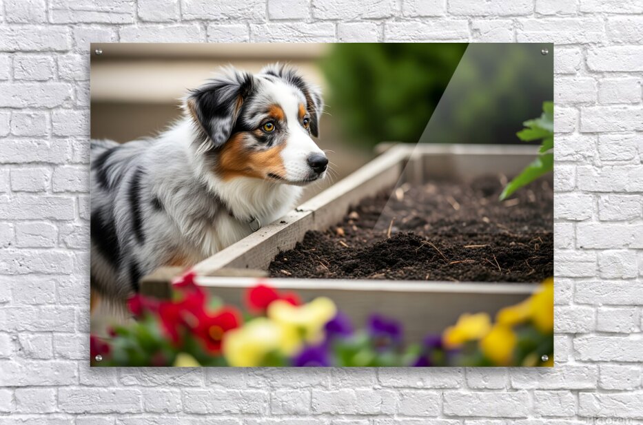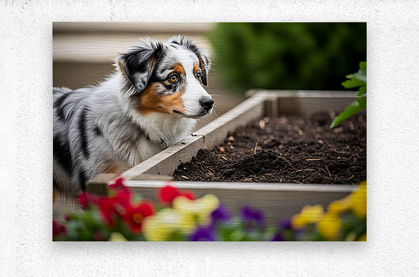 SUR CETTE OEUVRE: AUSTRALIAN SHEPHERD PUPPY DISCOVERS THE GARDEN BED