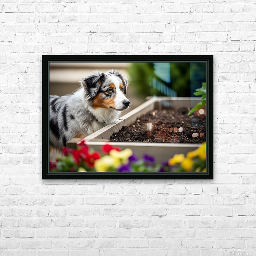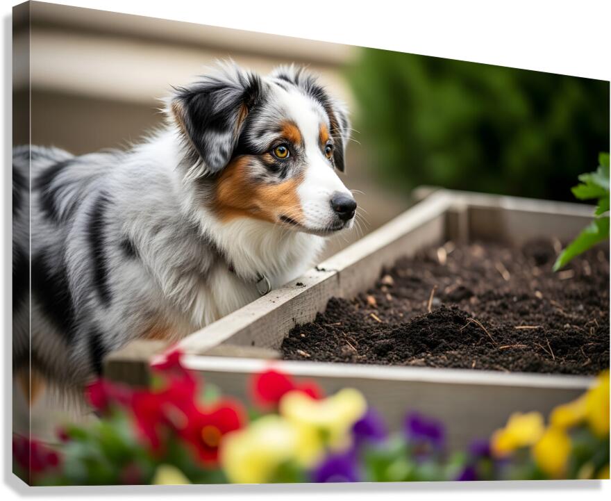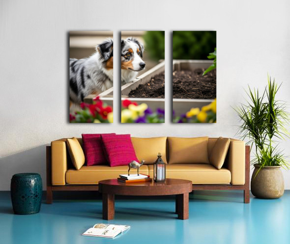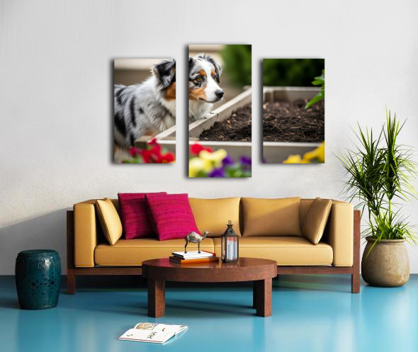 Australian Shepherd Puppy Discovers The Garden Bed Impression sur toile