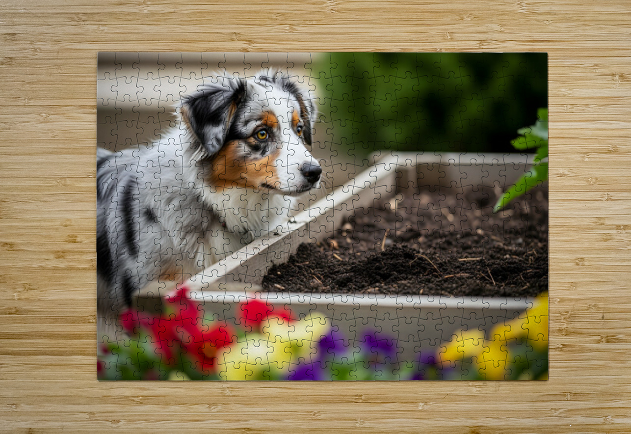 Australian Shepherd Puppy Discovers The Garden Bed Puppy Prints Impression de puzzle