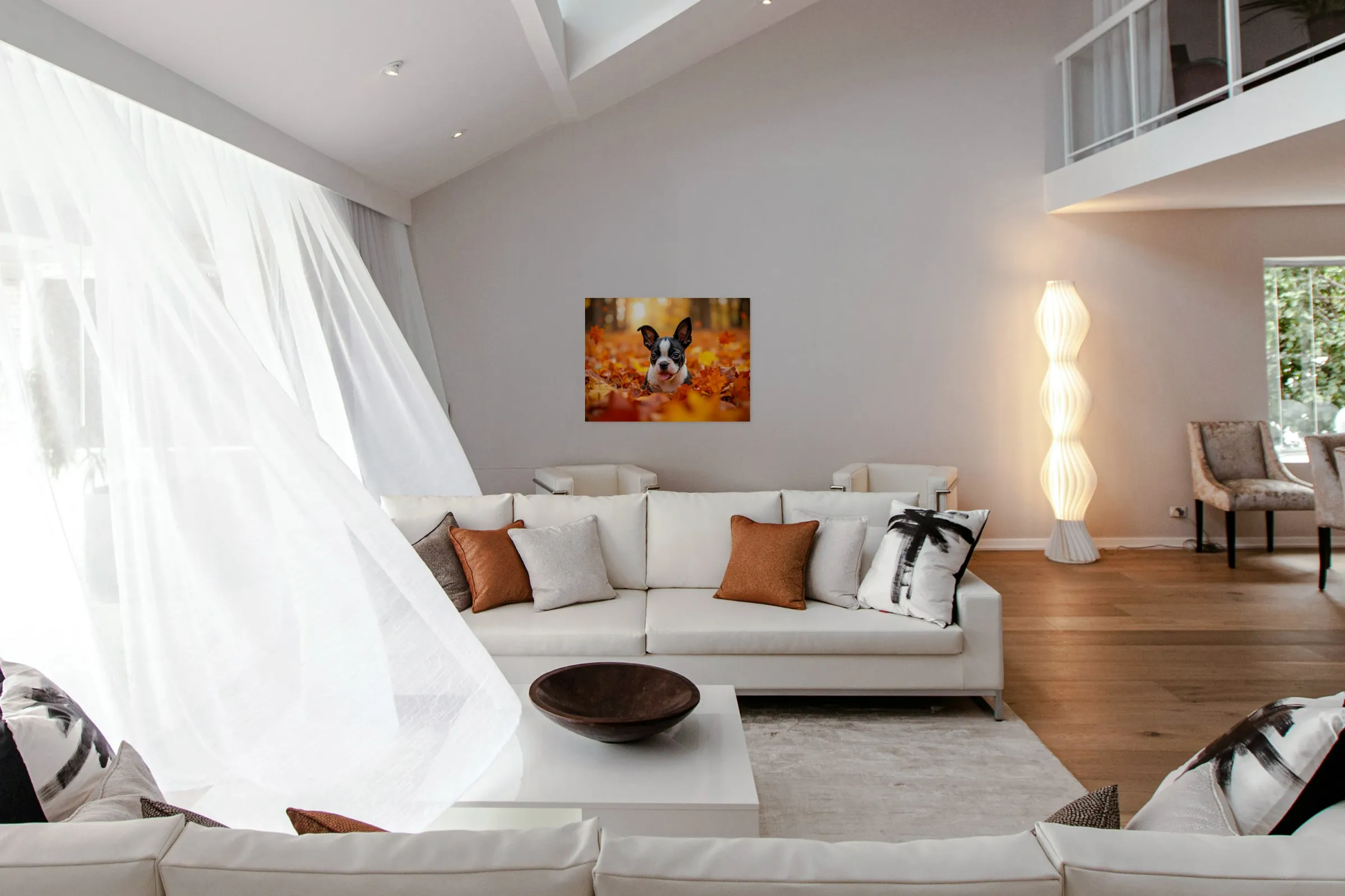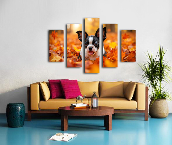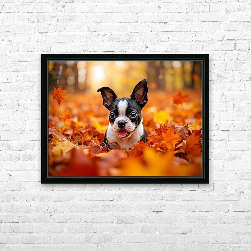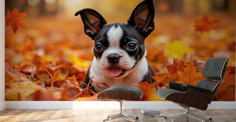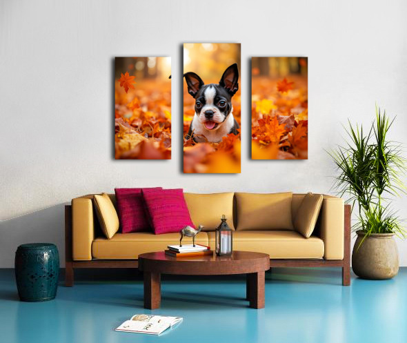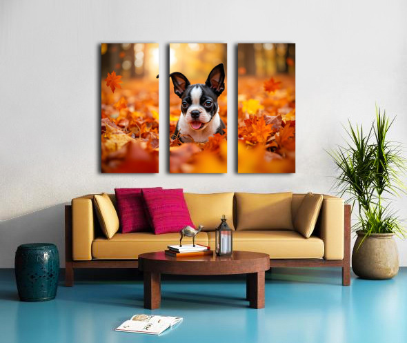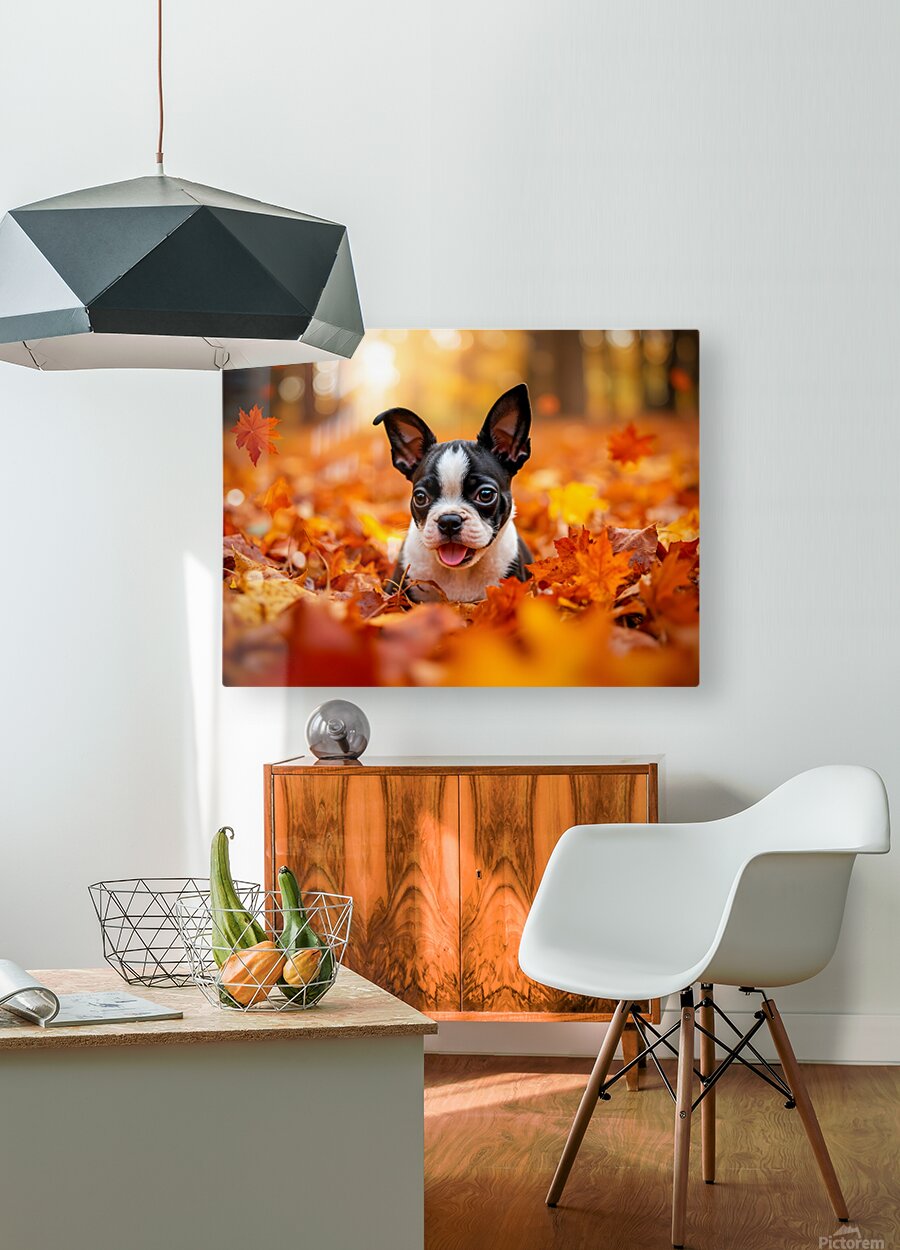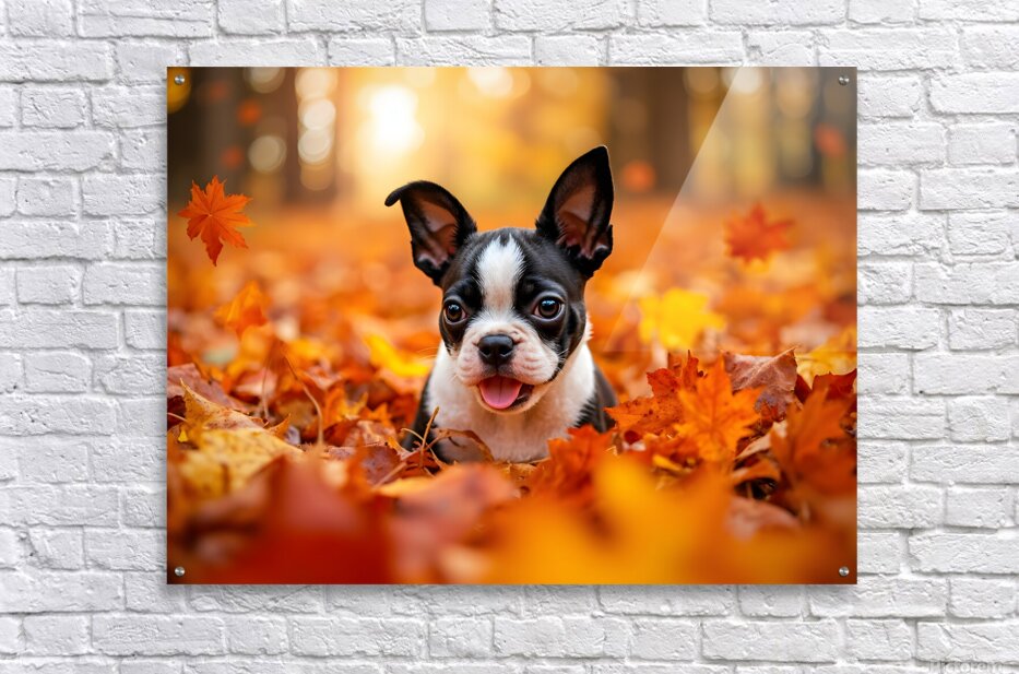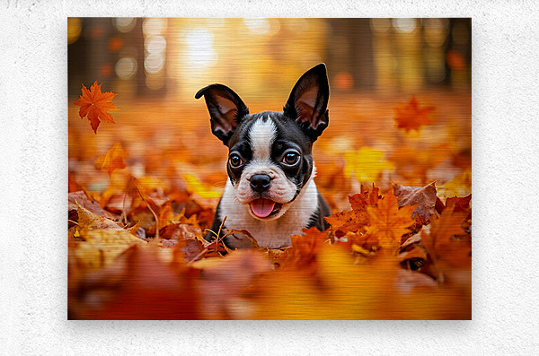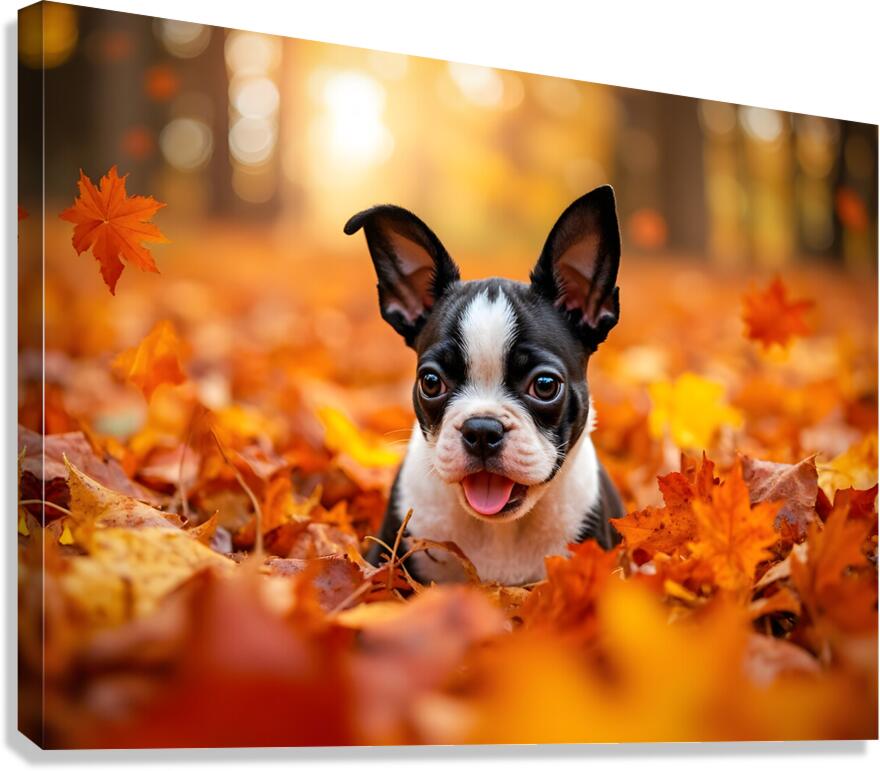 SUR CETTE OEUVRE: BOSTON TERRIER PUPPY DISCOVERS AUTUMN LEAF PILE