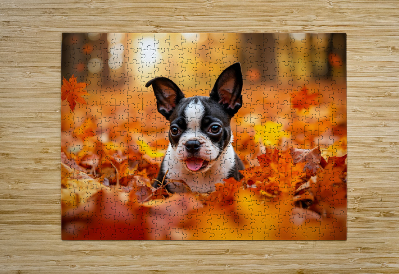 Boston Terrier Puppy Discovers Autumn Leaf Pile Puppy Prints Impression de puzzle