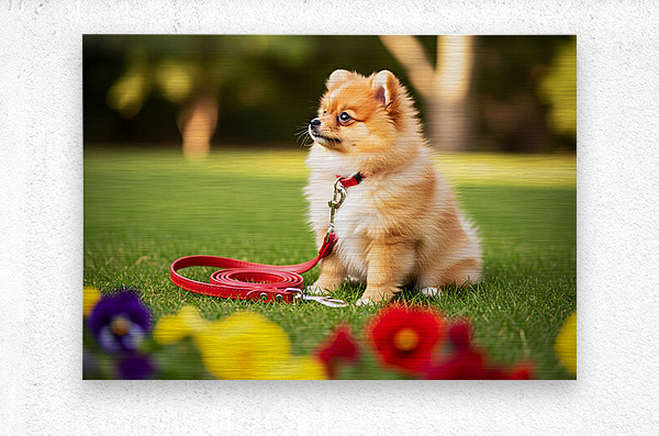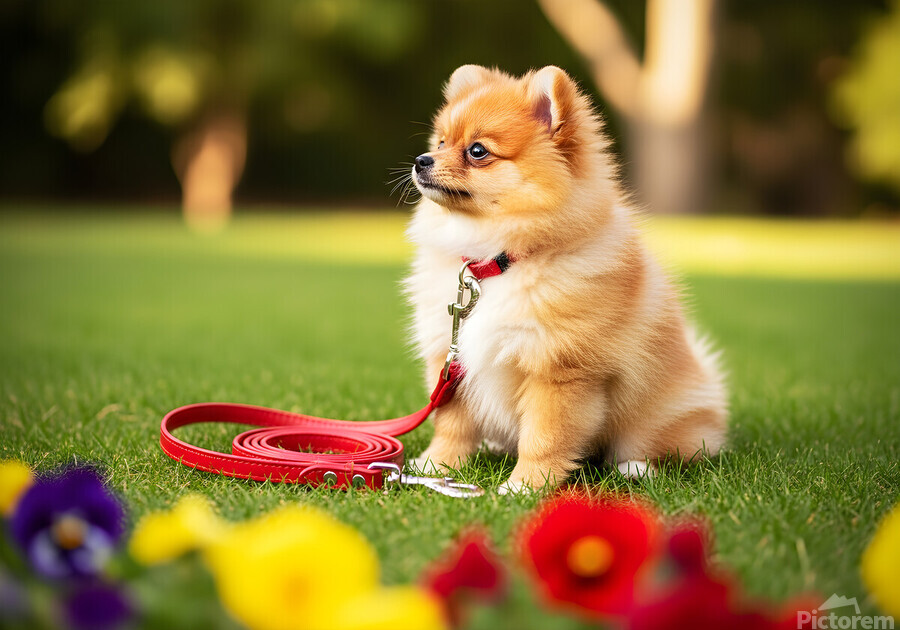 A tiny orange and white Pomeranian puppy sits on green grass gazing with curiosity at a bright red leash placed nearby. Soft-focus garden flowers create a dreamy foreground. Digital Artwork.