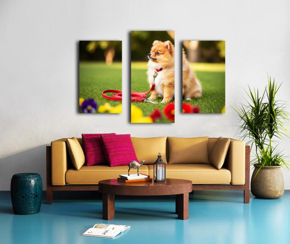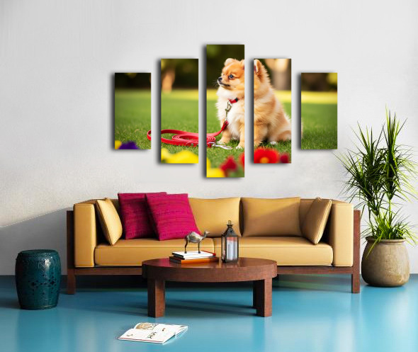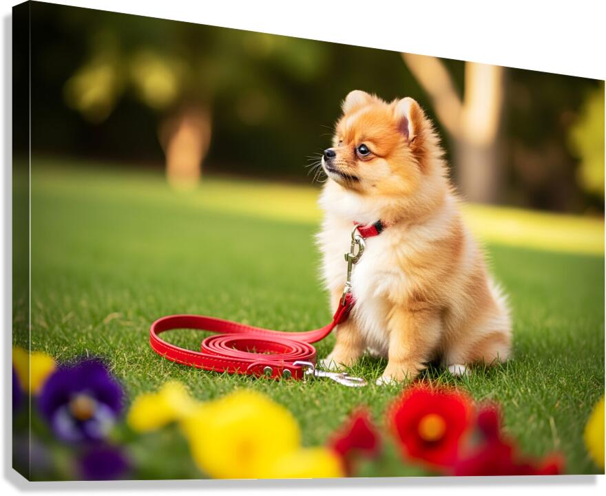 Pomeranian Puppy Discovers New Red Leash Impression sur toile
