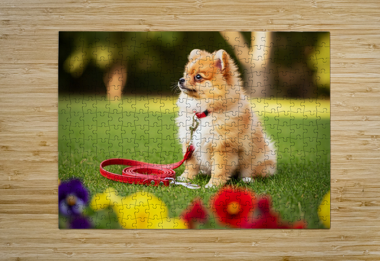 Pomeranian Puppy Discovers New Red Leash Puppy Prints Impression de puzzle