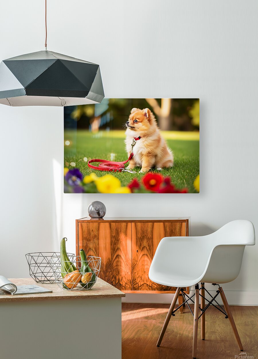 SUR CETTE OEUVRE: POMERANIAN PUPPY DISCOVERS NEW RED LEASH