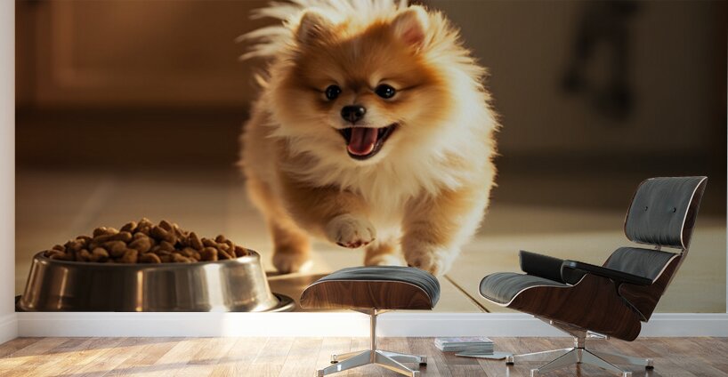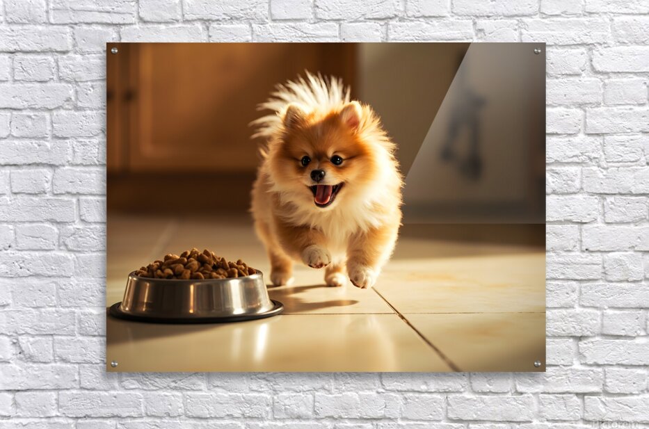 SUR CETTE OEUVRE: EXCITED POMERANIAN PUPPY CELEBRATES FULL FOOD BOWL