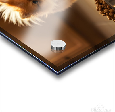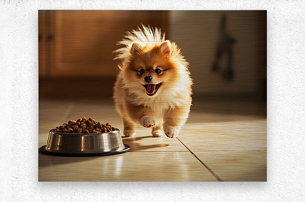 An ecstatic orange and white Pomeranian puppy wags its tail with pure joy beside a metal food bowl now filled with brown kibble. The happy pup bounces with excitement mouth open in delight at mealtime. Digital Artwork.