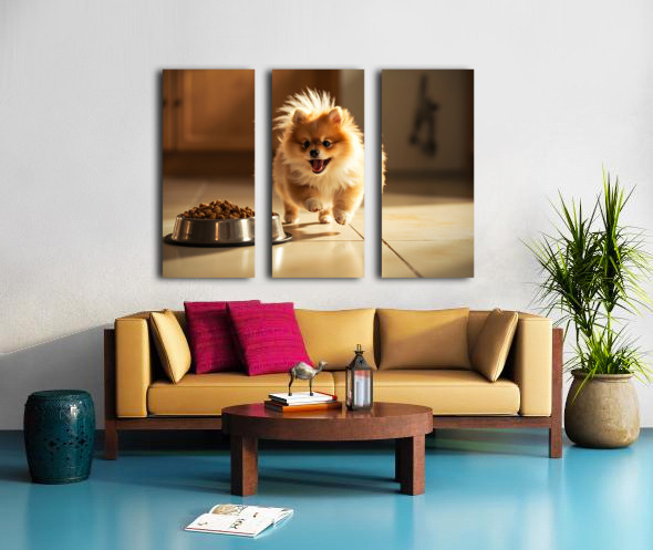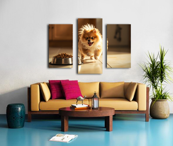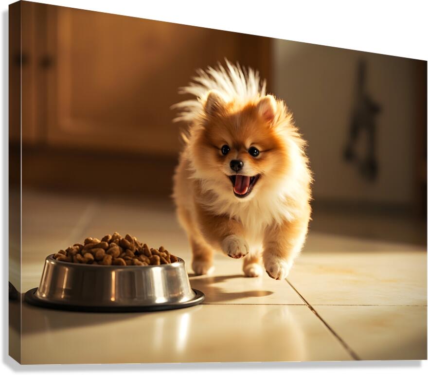 Excited Pomeranian Puppy Celebrates Full Food Bowl Impression sur toile
