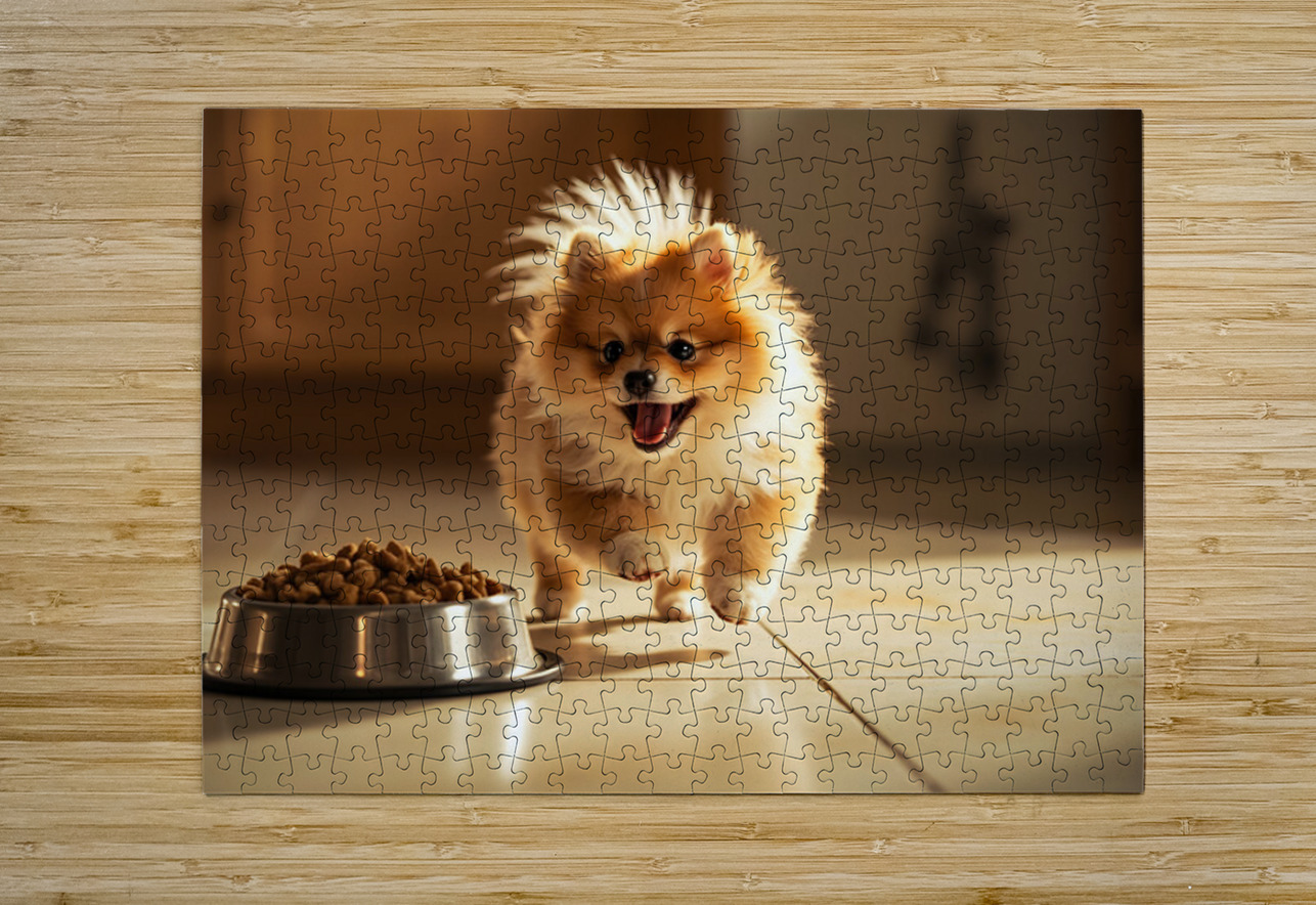 Excited Pomeranian Puppy Celebrates Full Food Bowl Puppy Prints Impression de puzzle