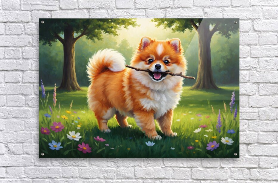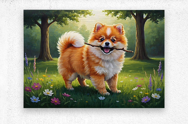 SUR CETTE OEUVRE: POMERANIAN PUPPY DISCOVERS PERFECT STICK