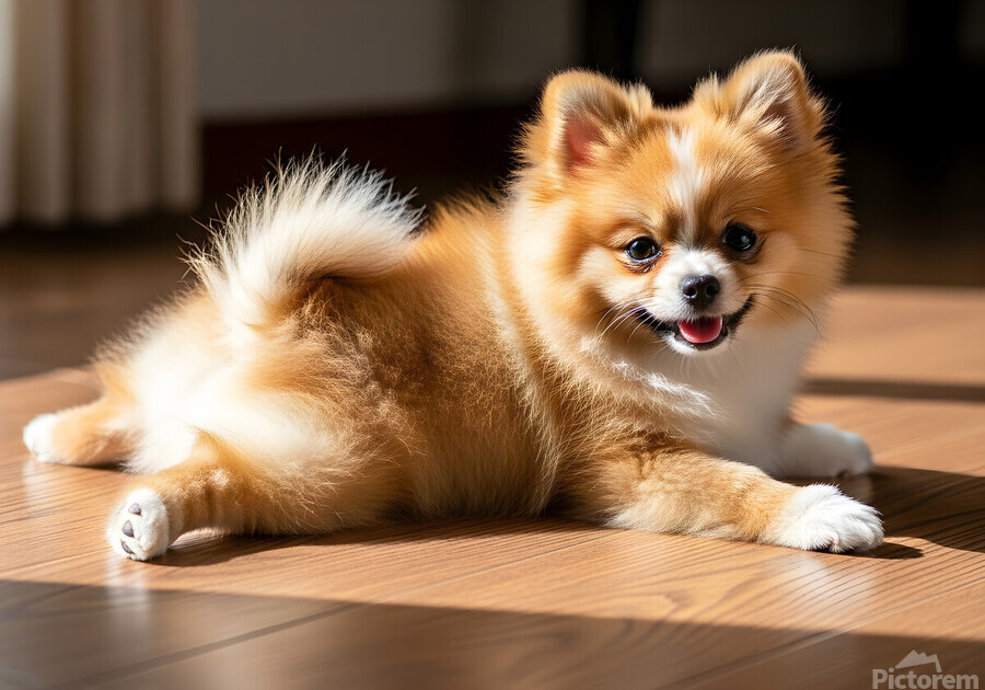 The content orange and white Pomeranian puppy settles back into another perfect sploot on the wooden floor showing it has discovered a new favorite relaxation position with a peaceful expression Digital Artwork.