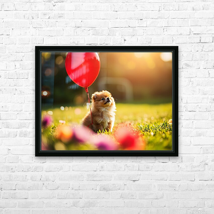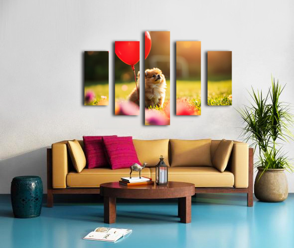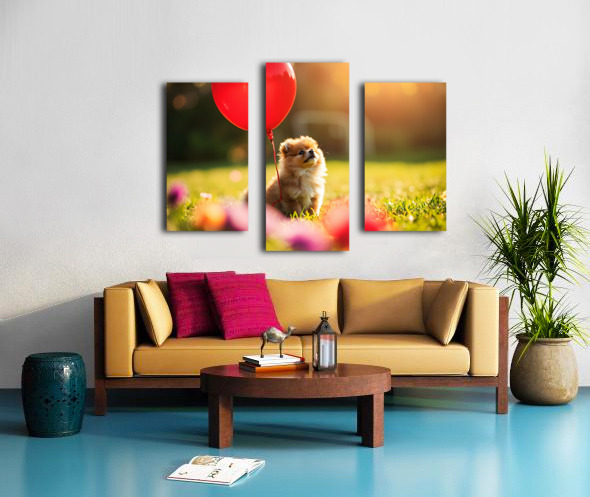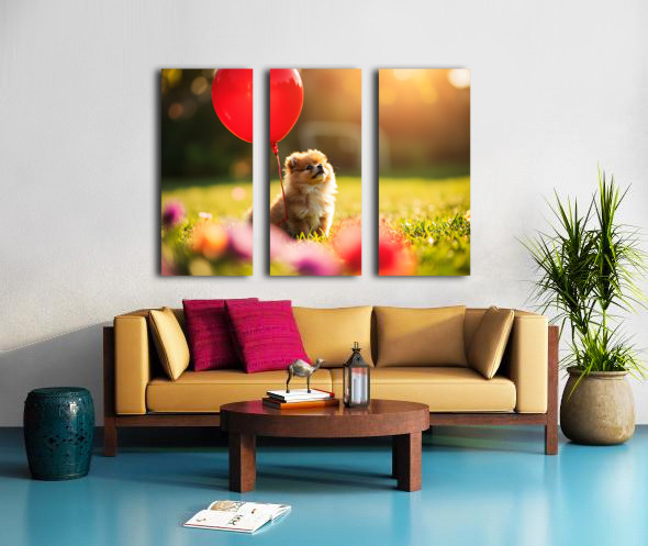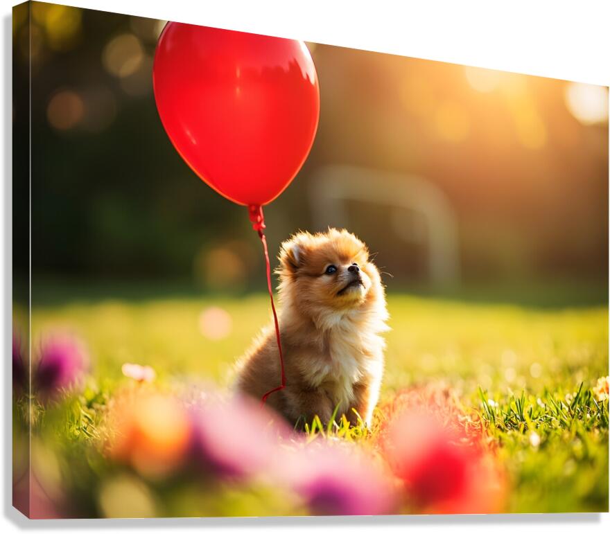 Pomeranian Puppy Discovers Floating Red Balloon Impression sur toile