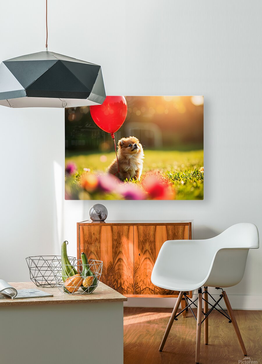 SUR CETTE OEUVRE: POMERANIAN PUPPY DISCOVERS FLOATING RED BALLOON