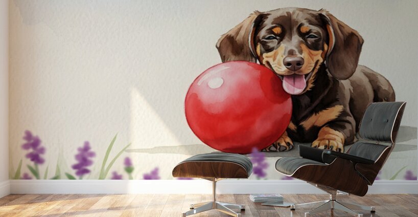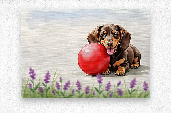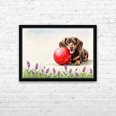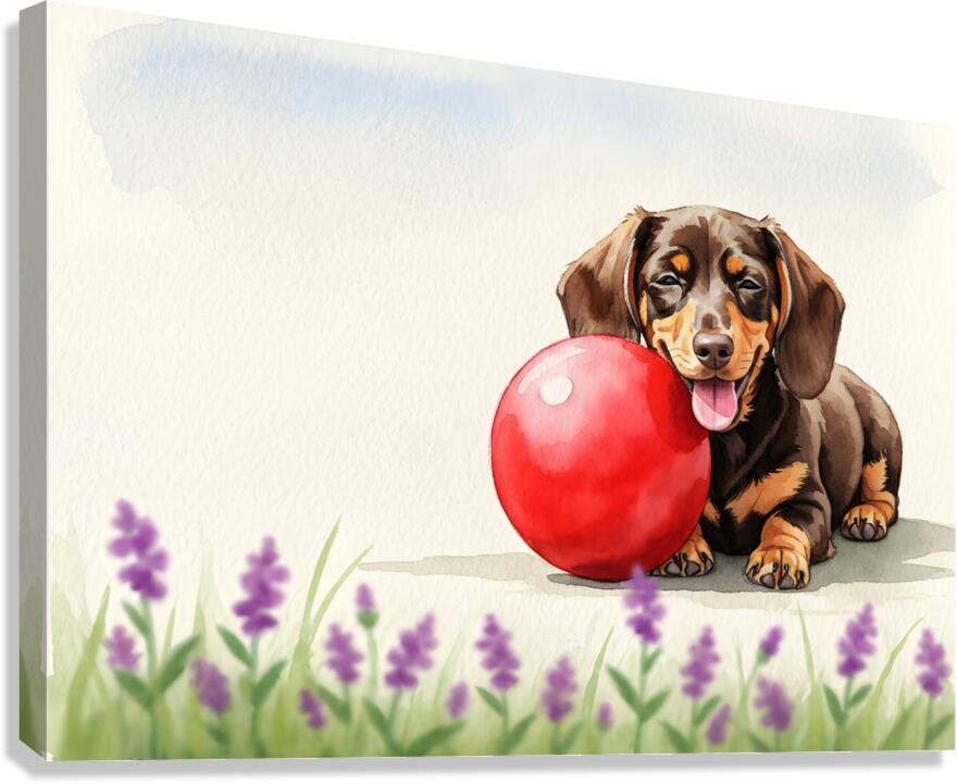 The adorable brown and tan dachshund puppy lies contentedly in the grass beside the large red rubber ball panting softly with a satisfied expression after an energetic play session. Digital Artwork.