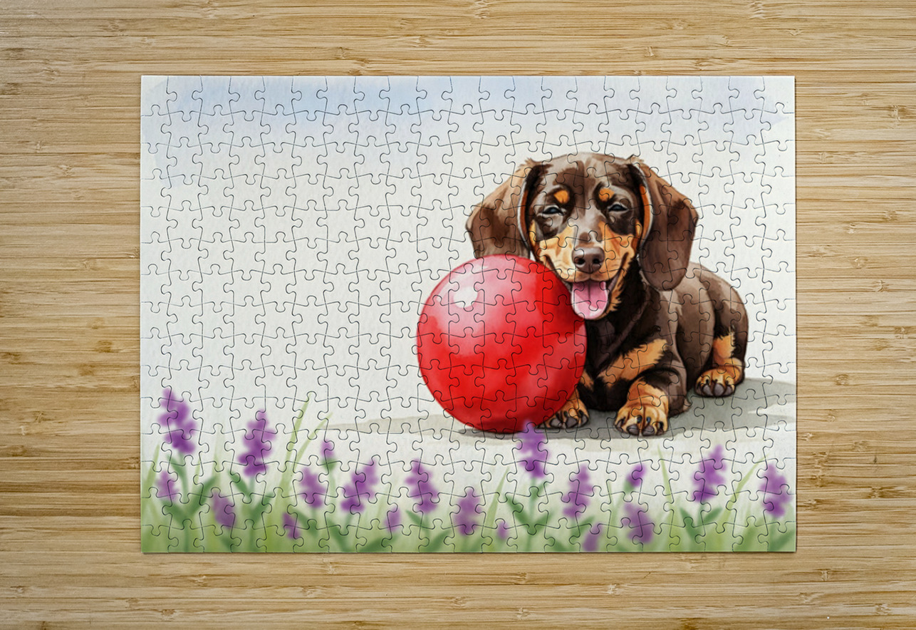 Exhausted Dachshund Puppy Rests Beside The Giant Ball Puppy Prints Impression de puzzle