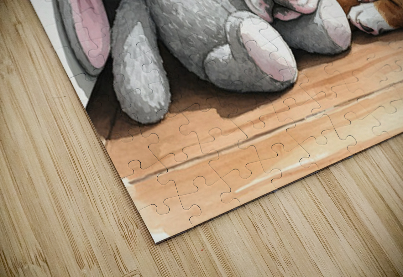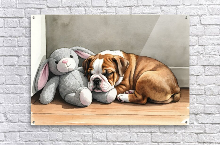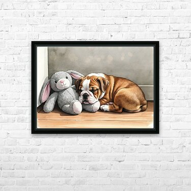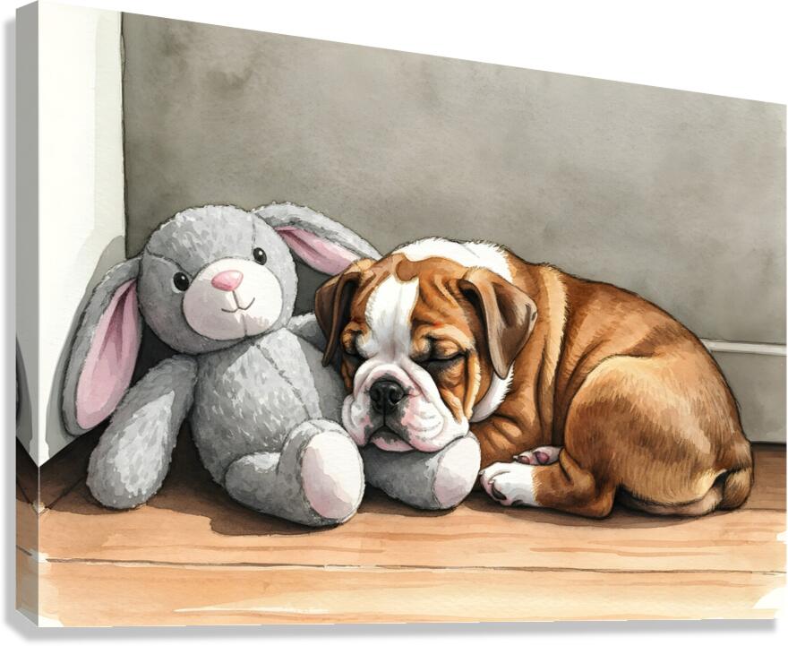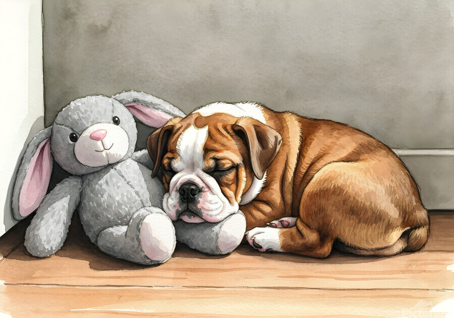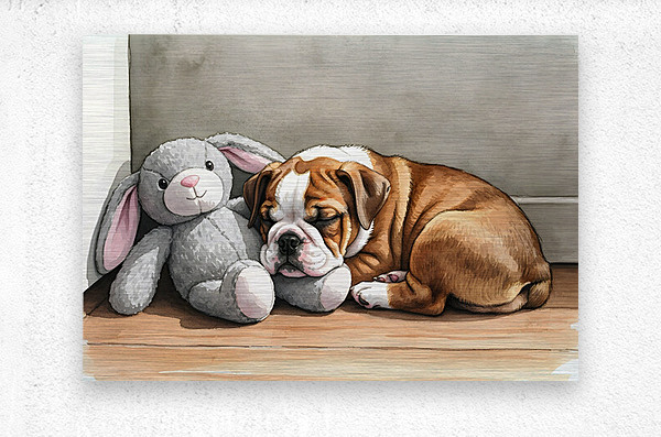 The tired bulldog puppy sleeps peacefully curled up on wooden flooring with his gray plush rabbit toy snuggled close beside him. Both look content and comfortable in their afternoon rest. Digital Artwork.